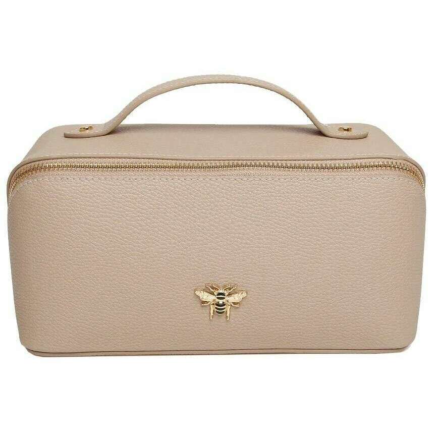 This women's large luxury train case has been made from 100% vegan faux leather, featured in a beige colour and is from the brand Alice Wheeler London. It measures 13cm(height) x 26cm(width) x 13cm(depth). All the bags come complete in alice wheeler london packaging. The Alice Wheeler London Large Luxury Train Case - Stone Beige is a stylish way to carry your toiletries, make-up or other travel essentials. Inside is fully lined and includes internal pockets for your smaller bits plus as a dual main section so it is easy to organise your things. Everything is sealed inside securely with its zipped closure and is finished with the iconically beautiful bee embellishment.