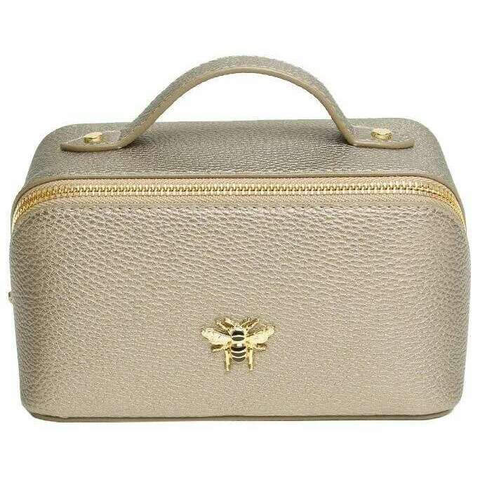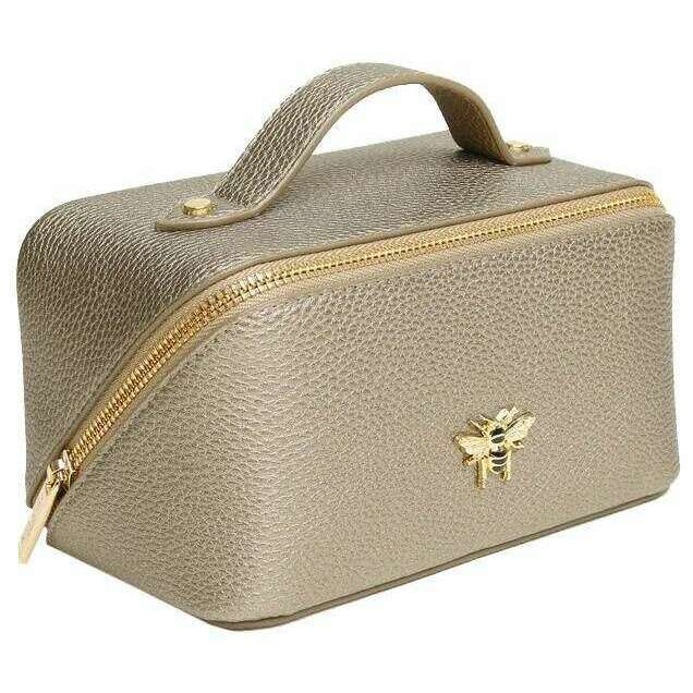 Designer Alice Wheeler London has brought you this women's 100% vegan faux leather bag using bronze tones. It measures 9.5cm(height) x 18cm(width) x 9.5cm(depth). All the bags come complete in alice wheeler london packaging. The Alice Wheeler London Mini Luxury Train Case - Bronze is a mini version of the popular Train case and is a stylishly cute way to carry your essential toiletries, make-up or other travel essentials. Inside is fully lined and includes internal pockets for your smaller bits plus as a dual main section so it is easy to organise your things. Everything is seals inside securely with its zipped closure and is finished with the iconically beautiful bee embellishment.