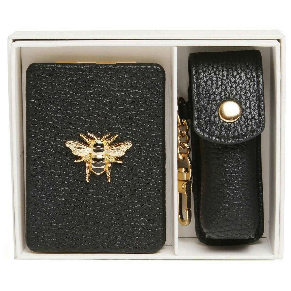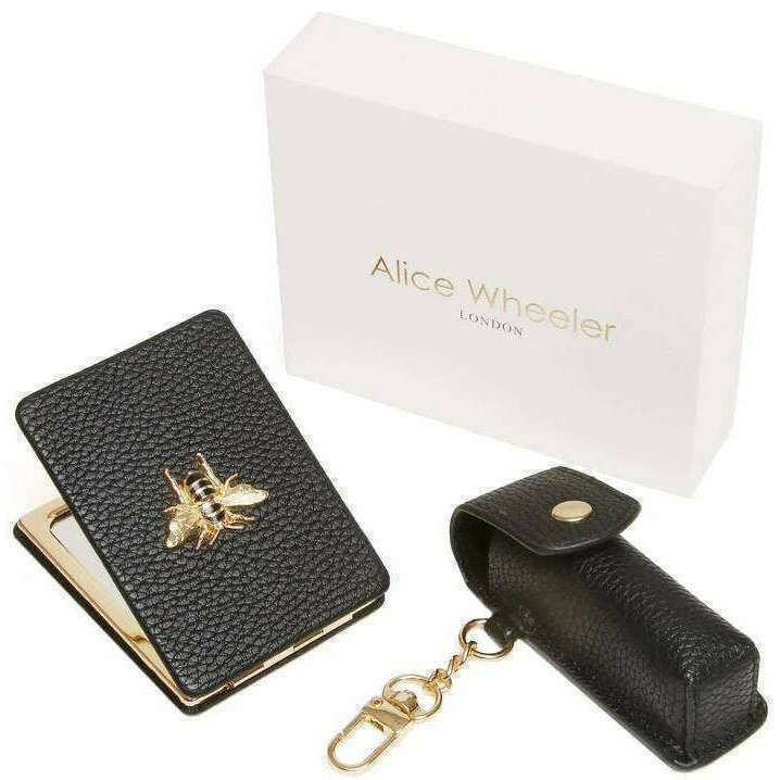 ({IF["This women's oblong compact mirror and lipstick holder gift set by the brand Alice Wheeler London is made from 100% vegan faux leather and is showcased in black. It measures mirror - 8.5cm(height) x 6cm(width) lipstick holder - 8.5cm(height) x 3cm(width) x 3cm(depth). All the compacts come complete with alice wheeler packaging. The Alice Wheeler London Oblong Compact Mirror and Lipstick Holder Gift Set - Black will make a stunning gift to yourself or someone you love. The beautifully iconic bee embellishment is featured on the mirror, and both have matching colours and hardware, making them a stylish matching pair. The mirror is great for everyday touch ups, and the lipstick holder is perfect for protecting your favourite everyday lipstick in style. These will be a perfect addition to your everyday bag, adding convenience."!=""]})