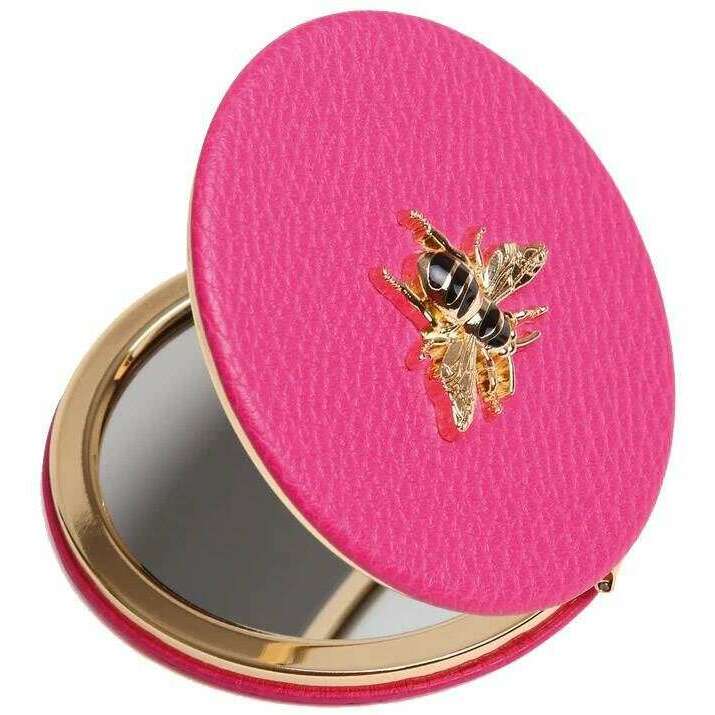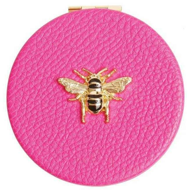 Perfect for women is this Alice Wheeler London hot pink round compact mirror, it is also made from 100% vegan faux leather. It measures 7cm(height) x 7cm(width). All the compacts come complete in alice wheeler london packaging. The Alice Wheeler London Round Compact Mirror - Hot Pink is the perfect accessory that is essential to carry around with you in your handbag. The beautifully iconic bee embellishment adorns the front of it. Inside is a 7x magnifying mirror with a twin gold-toned metal frame which is ideal for those day to day touch ups.