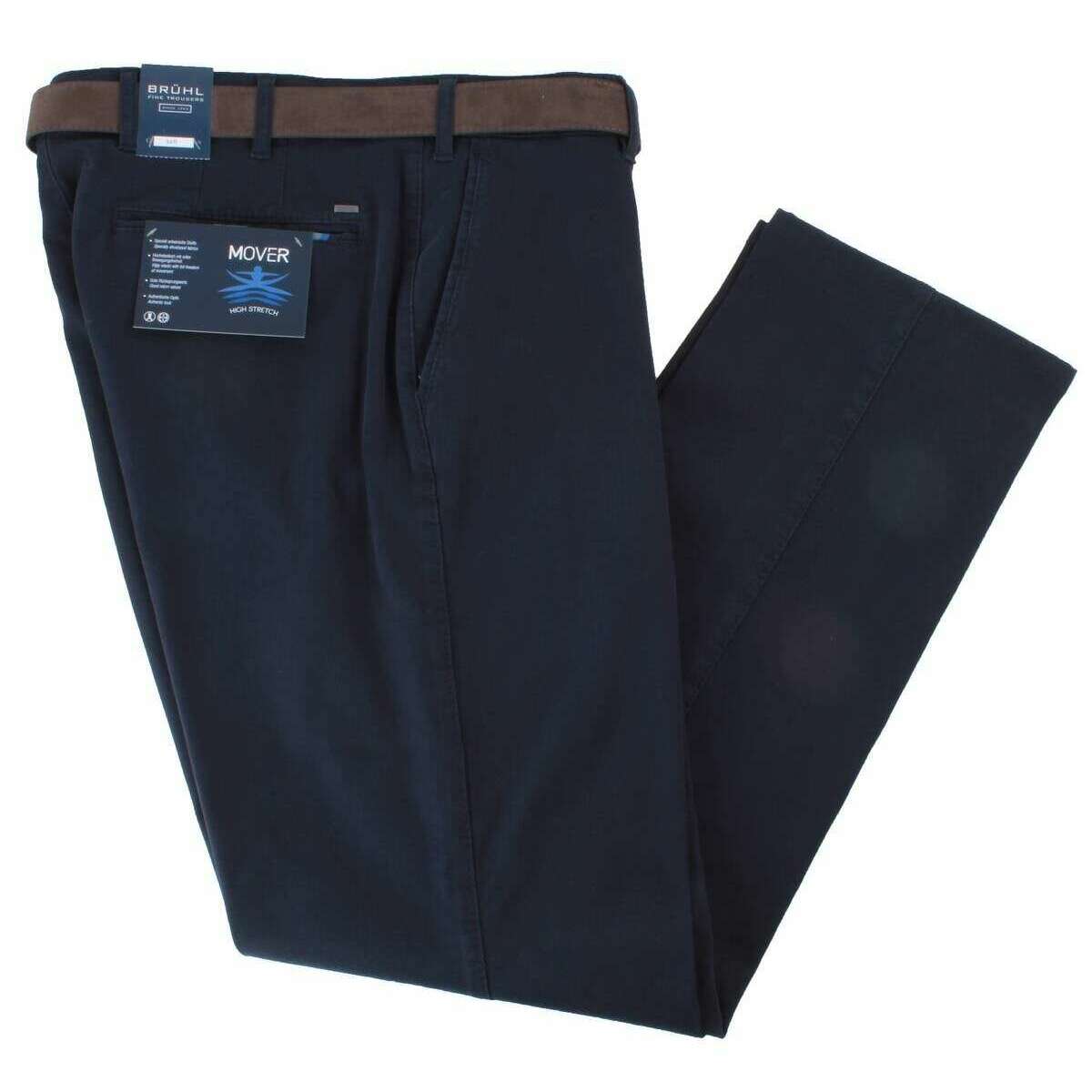 These men's parma b mover high stretch peached chinos have been made from 98% cotton and 2% elastane, featured in a navy colour and are from the brand BRUHL. Also the marine navy trousers are designed in a plain pattern, It is recommended to wash at 40 degrees to keep these trousers in good condition. All the trousers come complete with bruhl tags. The BRUHL Parma B Mover High Stretch Peached Chinos - Marine Navy are designed to deliver comfort, flexibility, and style. Made from a high-stretch fabric, these chinos allow for effortless movement throughout the day. The stretch waistband ensures a comfortable and adaptive fit, while the peached structure gives the fabric a soft and refined finish for a premium feel. These chinos feature two quarter pockets for easy access and two button-through panel pockets for secure storage. With eight belt loops, they provide a stable hold for your belt, and the bottom width of 16 inches creates a modern, tailored silhouette. Perfect for smart-casual occasions, these chinos combine practicality with elegance, making them an essential addition to any wardrobe.