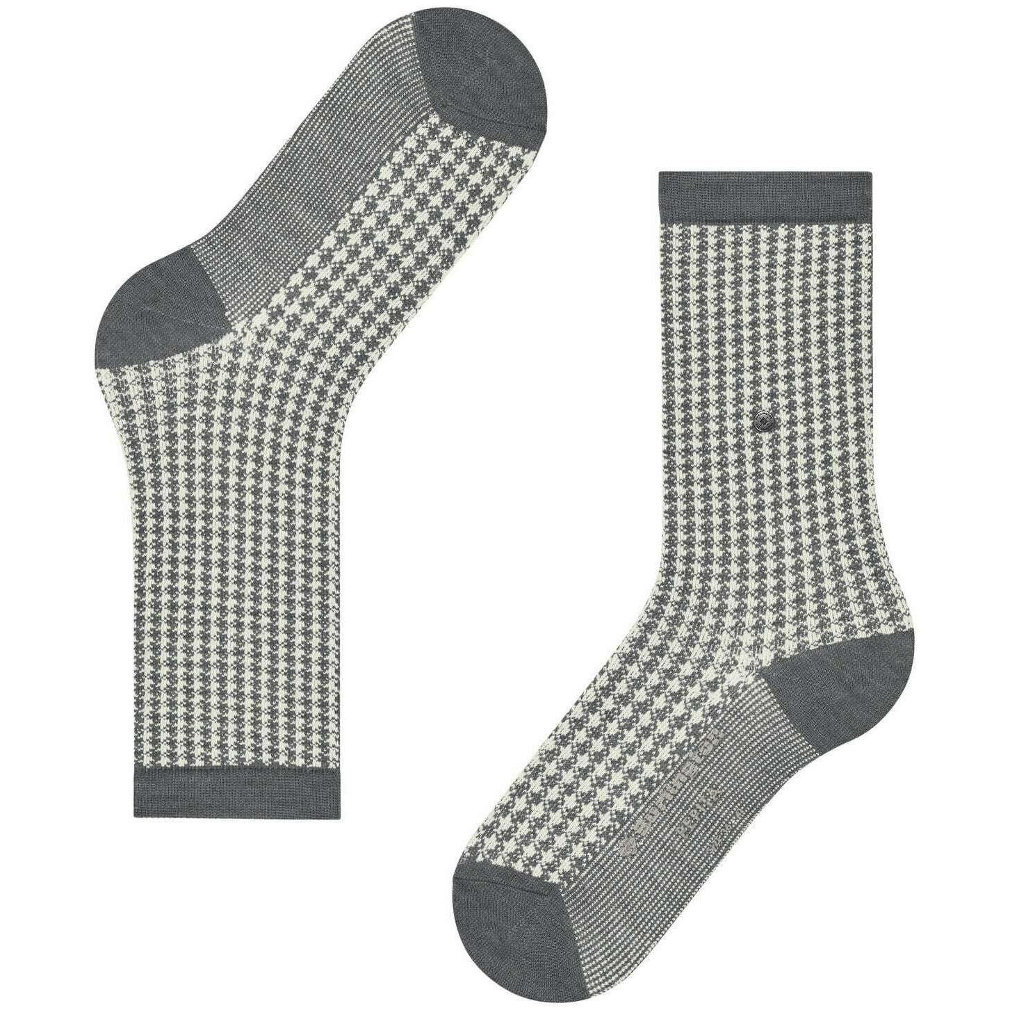 Introducing these women's pepita socks by Burlington, they are manufactured from 73% virgin wool, 25% polyamide (8% recycled) and 2% elastane in a dark grey colour. Also the dark grey socks are designed in a houndstooth pattern, It is recommended to wash at 30 degrees to keep these socks in good condition. All the socks come complete with burlington socks tags. The Burlington Pepita Socks - Dark Grey are a stylish, unique addition to any wardrobe, designed to add a touch of flair while ensuring comfort and durability. These socks combine the delicate houndstooth design with the iconic Burlington clip on the side to enhance any outfit. The warming wool blend keeps these socks breathable, while the stretch fabric ensures they fit comfortably without slipping.