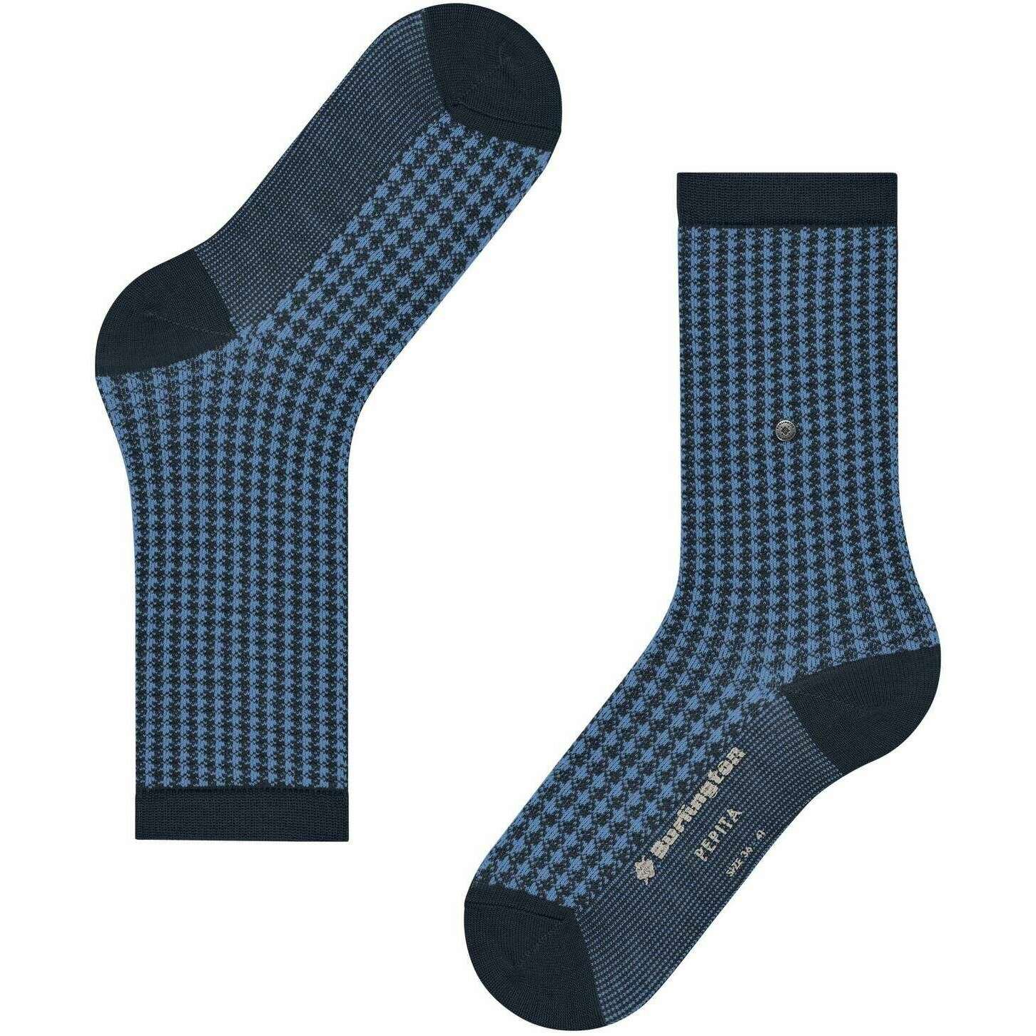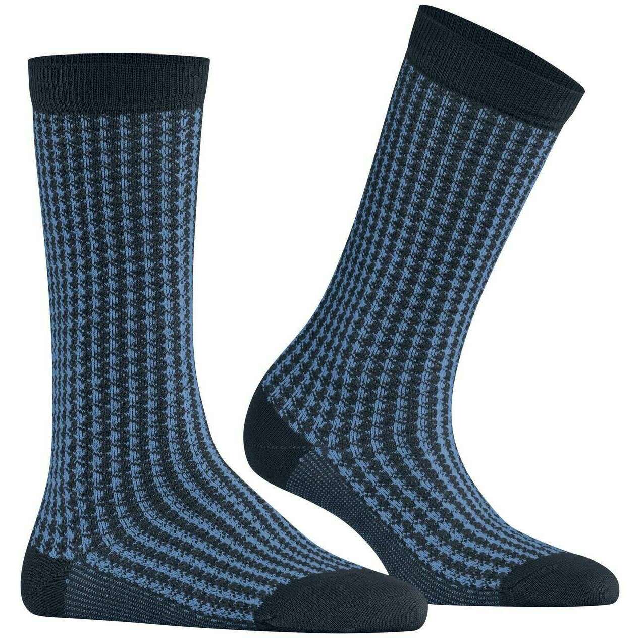 Perfect for women are these Burlington marine blue pepita socks, they are also made from 73% virgin wool, 25% polyamide (8% recycled) and 2% elastane. Also the marine blue socks are designed in a houndstooth pattern, It is recommended to wash at 30 degrees to keep these socks in good condition. All the socks come complete with burlington socks tags. The Burlington Pepita Socks - Marine Blue are a stylish, unique addition to any wardrobe, designed to add a touch of flair while ensuring comfort and durability. These socks combine the delicate houndstooth design with the iconic Burlington clip on the side to enhance any outfit. The warming wool blend keeps these socks breathable, while the stretch fabric ensures they fit comfortably without slipping.