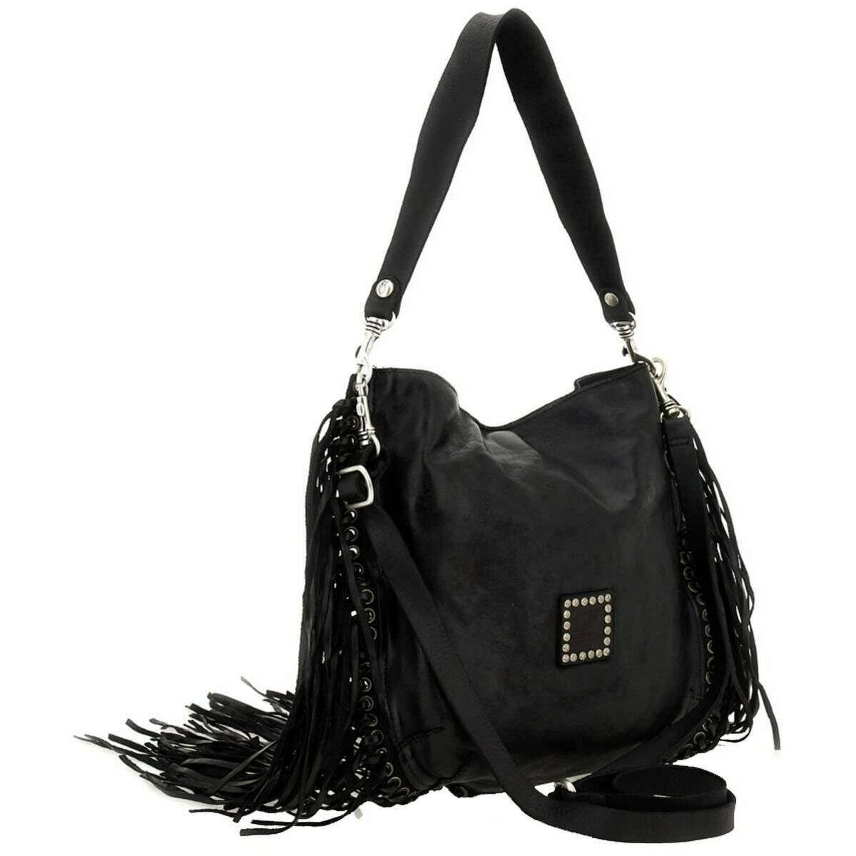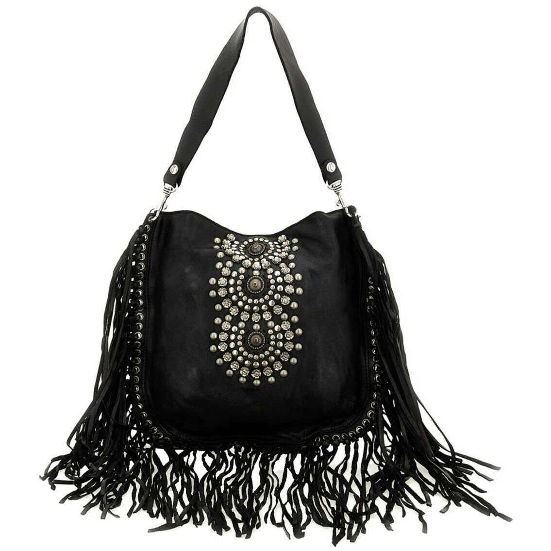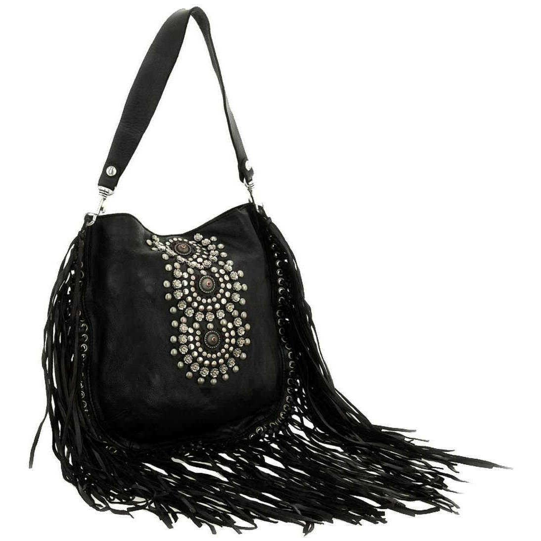 Manufactured from 100% cowhide leather is this black women's camelia shoulder bag by the designer Campomaggi. It measures 30cm(height) x 30cm(width) x 0.5cm(depth). Campomaggi have made this camelia shoulder bag in Italy. It is recommended to brush with a damp cloth and avoid using detergents to keep this bag in good condition. All the bags come complete with campomaggi packaging. The Campomaggi Camelia Shoulder Bag - Black is a must-have everyday bag adding luxury and a fun look to your attire. Featuring tassels and rhinestones adds an elegant and girly touch whilst the detachable shoulder strap and the detachable adjustable crossbody strap adds versatility depending on the occasion. The main compartment offers ample storage ensuring you will have your essentials with you. Crafted from premium leather, it features a beautiful vintage-inspired colour achieved through vegetable tanning which a traditional process that uses natural ingredients for a rich finish.