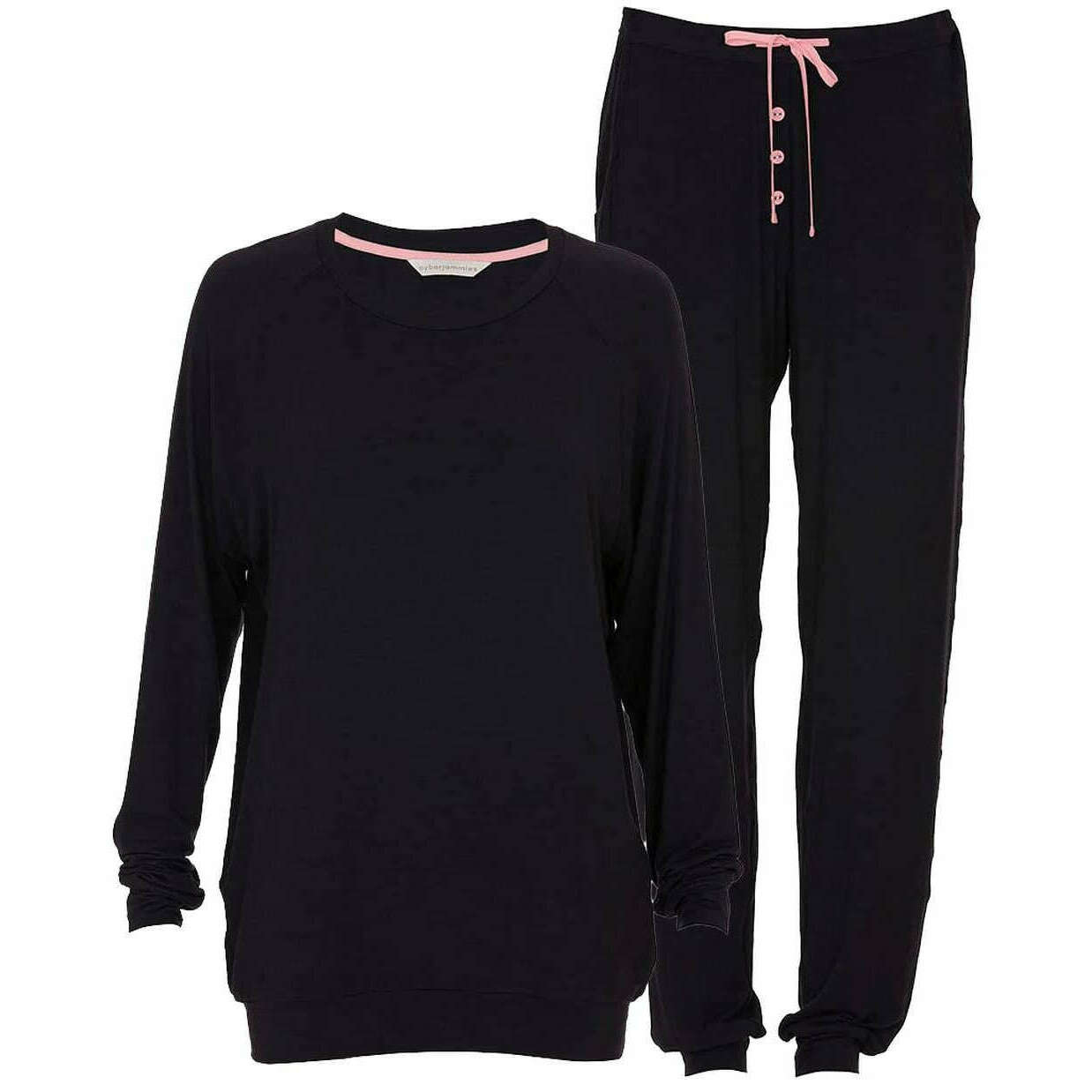 These women's bonnie slouch jersey pyjama set by the brand Cyberjammies are made from 95% modal and 5% elastane and are showcased in black. Also the black pyjamas are designed in a plain pattern, It is recommended to machine wash inside out, do not soak, wash with like colours to keep these pyjamas in good condition. All the pyjamas come complete with cyberjammies tags. The Cyberjammies Bonnie Slouch Jersey Pyjama Set - Black will make those comfy moments even comfier. Wear these simply gorgeous, loose fitting, yet not too baggy pjs whenever you are chilling at home and revel in the soft, stretchy material and embrace them like a second skin. The bottoms feature an elasticated waistband with flat buttons and an adjustable drawstring to ensure absolute comfort. Thoughtfully designed for restful nights and relaxed mornings, the Jersey Slouch jammies will become a staple in your collection.
