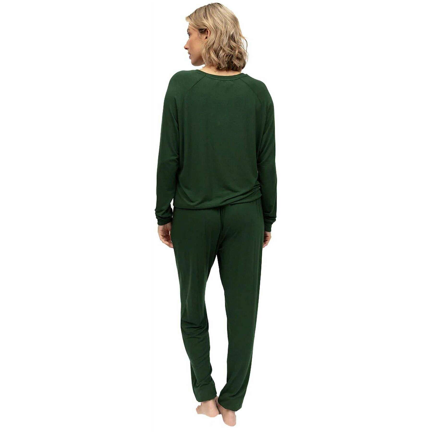 These women's olive slouch jersey pyjama set by the brand Cyberjammies are made from 95% modal and 5% elastane and are showcased in green. Also the olive green pyjamas are designed in a plain pattern, It is recommended to machine wash inside out, do not soak, wash with like colours to keep these pyjamas in good condition. All the pyjamas come complete with cyberjammies tags. The Cyberjammies Olive Slouch Jersey Pyjama Set - Olive Green will make those comfy moments even comfier. Wear these simply gorgeous, loose fitting, yet not too baggy pjs whenever you are chilling at home and revel in the soft, stretchy material and embrace them like a second skin. The bottoms feature an elasticated waistband with flat buttons and an adjustable drawstring to ensure absolute comfort. Thoughtfully designed for restful nights and relaxed mornings, the Jersey Slouch jammies will become a staple in your collection.