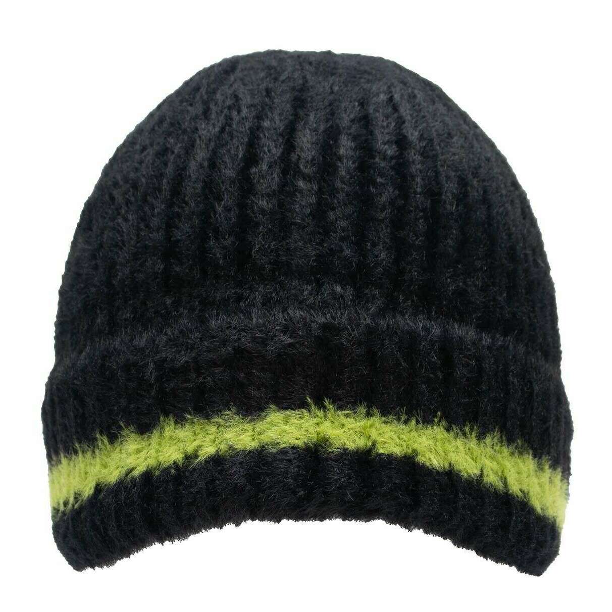 Dents Feather Yarn Beanie Hat - Black/Lime Green