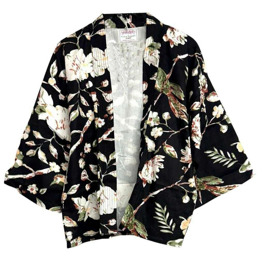This well made women's serendipity short kimono from Elie Beaumont comes in a black meadow colour and is manufactured from 100% natural cotton. All the jackets come complete with elie beaumont packaging. The Elie Beaumont Serendipity Short Kimono - Black Meadow will provide you with a real standout look that you are sure to love! The bold colours and the intricate design makes this kimono jacket really standout. This kimono is fully lined, breathable and has length sleeves.