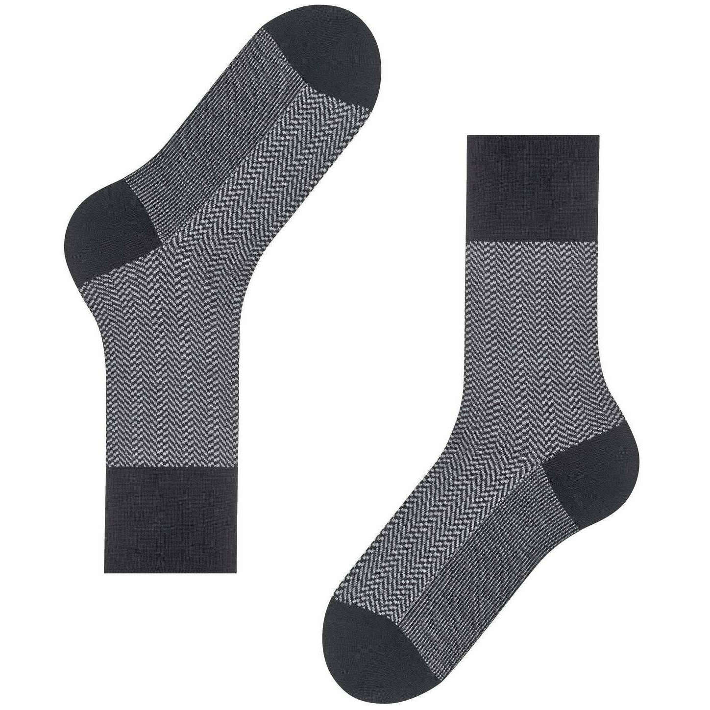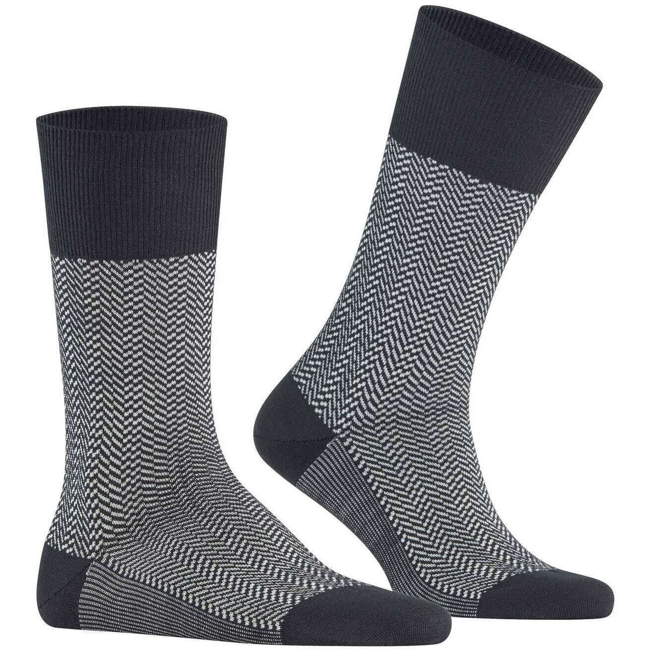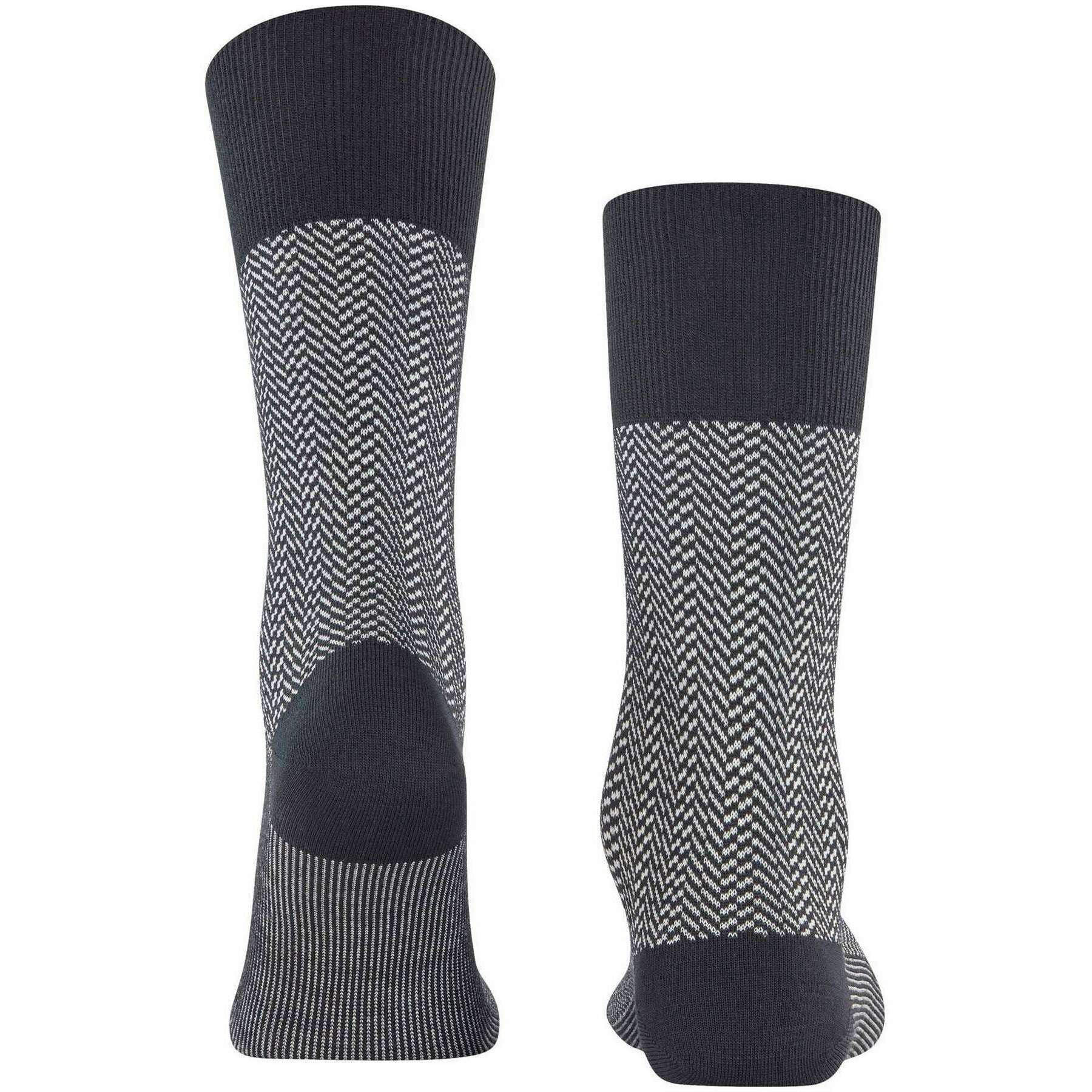 These men's airport herringstripe socks by the brand Falke are made from 62% virgin wool, 24% polyamide, 13% cotton and 1% elastane and are showcased in black. Also the black socks are designed in a herringbone pattern, It is recommended to wash at 30 degrees to keep these socks in good condition. All the socks come complete with falke tags. The Falke Airport Herringstripe Socks - Black are woven with the correct combination of light, climate-regulating merino wool on the outside and pleasant soft cotton on the inside. For work or leisure, these socks have extended cuffs for a wrinkle fit on the leg. The reinterpreted, two-tone herringbone pattern adds a modern and stylish touch and lends a special flair to any outfit. Stay comfortable all day with the Falke Perfect fit and enjoy wearing these socks over and over with optimal durability thanks to reinforced stress zones.