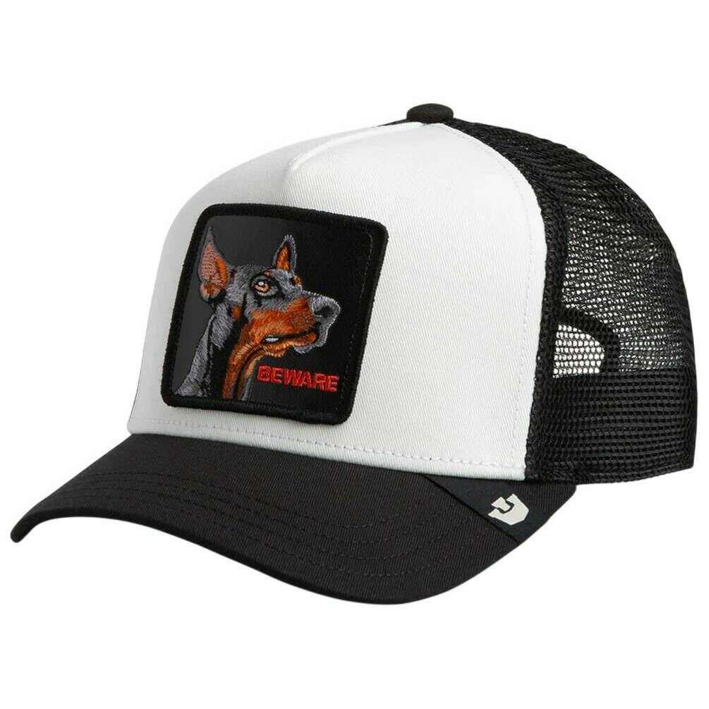 Perfect for men or women is this Goorin Bros dust white/void black beware trucker hat, it is also made from 57% polyester and 43% cotton. All the hats come complete with goorin bros tags. The Goorin Bros Beware Trucker Hat - Dust White/Void Black delivers a message of vigilance, strength, and character. This standout Goorin Bros design features a distinctive Doberman patch that instantly grabs attention and creates a powerful presence. The glossy patch showcases an intricately embroidered dog head, giving the cap a dynamic yet refined aesthetic. A crisp white front panel contrasts strikingly with the black visor and mesh back, resulting in a modern and highly expressive look. Comfort complements style, thanks to the breathable mesh insert and reliable snapback fit ideal for everyday wear. With its high?quality craftsmanship, iconic silhouette, and confident design, this cap is perfect for anyone who wants to make a bold and commanding statement.