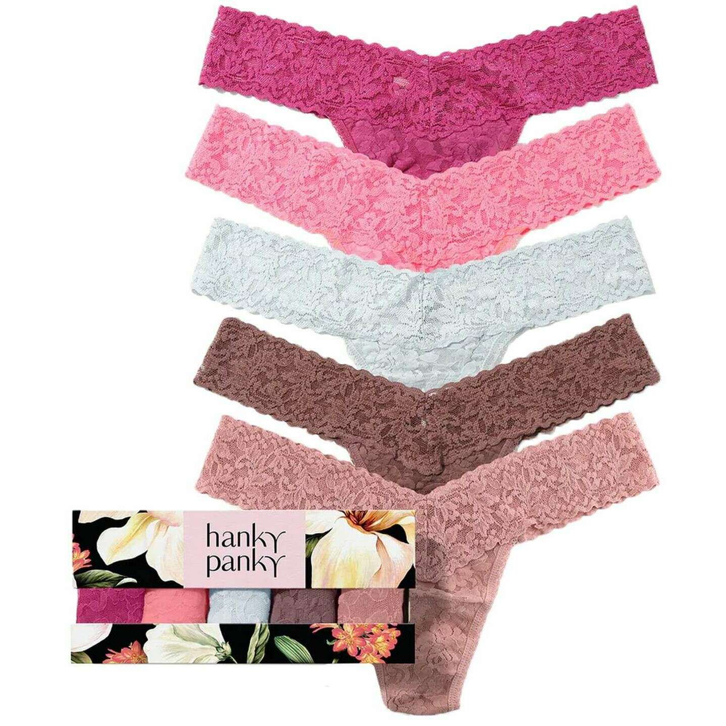 This women's signature lace 5 pack low rise thong by the brand Hanky Panky is made from 100% nylon body, 90% nylon, 10% spandex trim and 100% supima cotton crotch lining and is showcased in pink. Hanky Panky have made this signature lace 5 pack low rise thong in USA. It is recommended to hand wash in cool water with mild detergent and dry flat to keep this underwear in good condition. 5 pack underwear is value for money ensuring they are a good buy, All the underwear comes complete with hanky panky packaging. The Hanky Panky Signature Lace 5 Pack Low Rise Thong - Wild Rose, Peachfizz, Pearl Grey, Artichoke Heart, Desert Rose are certain to impress with their super comfortable fit and feminine design. These thongs have been flawlessly crafted with a design that sits lower on the hips and will give you no visible panty line when wearing for any occasion. Their V-front and V-back waistband will keep these looking stylish on you all year round. Make these the most ideal new underwear you can buy.