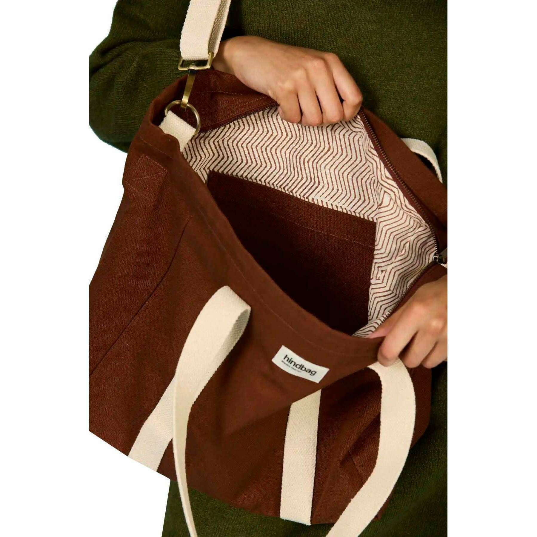 Manufactured from 100% organic cotton is this chocolate brown unisex cesar small tote bag by the designer Hindbag. It measures 33cm(height) x 51cm(width) x 14cm(depth). All the bags come complete with hindbag packaging. The Hindbag Cesar Small Tote Bag - Chocolate Brown is a versatile and eco-conscious accessory designed for everyday use. Crafted from thick, GOTS-certified organic cotton, this tote combines durability with sustainability. The spacious interior makes it ideal for carrying essentials, including a medium-sized laptop in an Ava case. Featuring a secure zip closure and an inner pocket for organization, the design of this bag allows for multiple carrying options, over the shoulder, across the body, or by hand, catering to various preferences.
