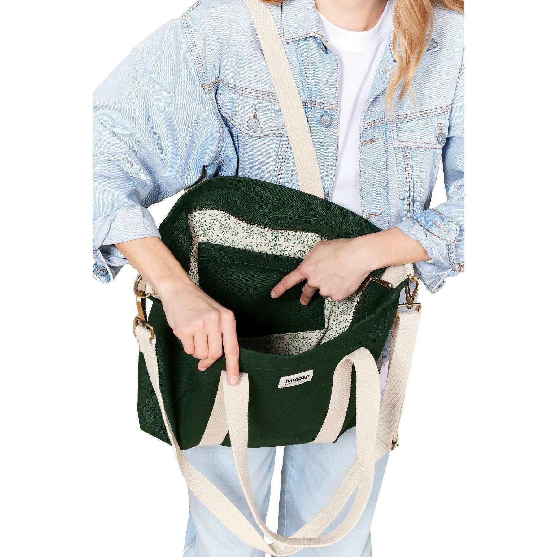 This cesar small tote bag for men or women is fashioned by the brand Hindbag in a green colour and is made from 100% organic cotton. It measures 33cm(height) x 51cm(width) x 14cm(depth). All the bags come complete with hindbag packaging. The Hindbag Cesar Small Tote Bag - Forest Green is a versatile and eco-conscious accessory designed for everyday use. Crafted from thick, GOTS-certified organic cotton, this tote combines durability with sustainability. The spacious interior makes it ideal for carrying essentials, including a medium-sized laptop in an Ava case. Featuring a secure zip closure and an inner pocket for organization, the design of this bag allows for multiple carrying options, over the shoulder, across the body, or by hand, catering to various preferences.