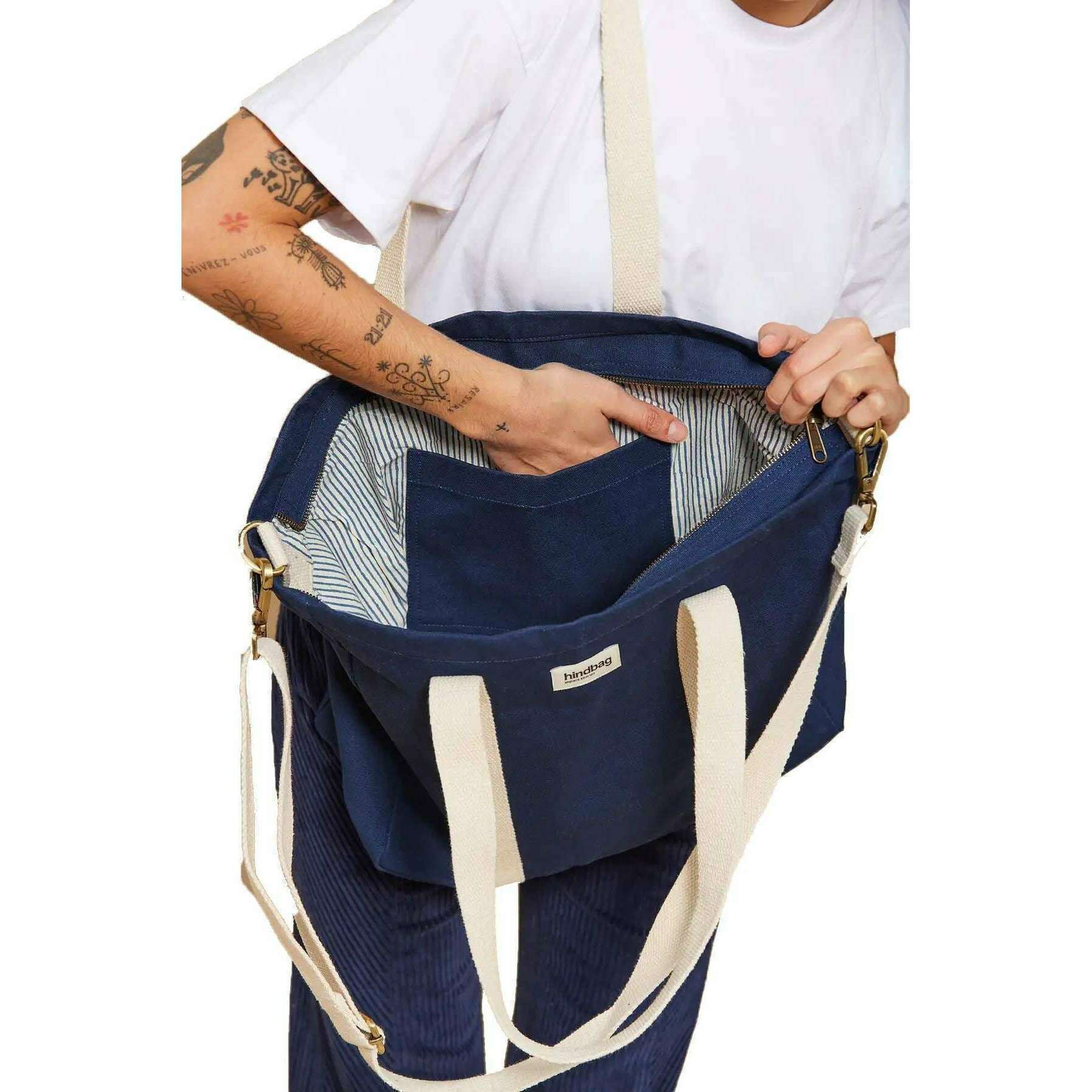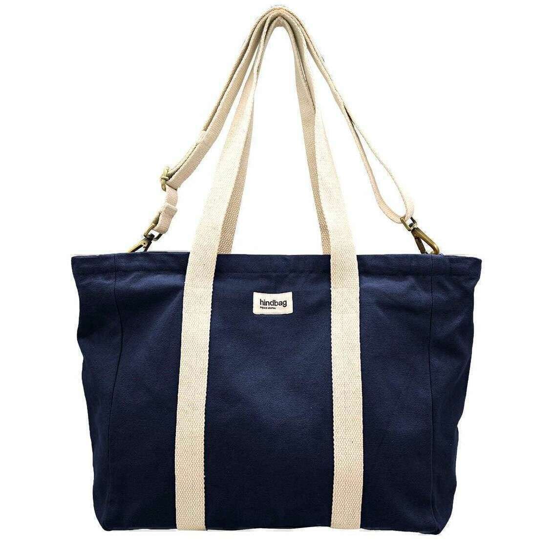 This unisex cesar small tote bag has been made from 100% organic cotton, featured in a blue colour and is from the brand Hindbag. It measures 33cm(height) x 51cm(width) x 14cm(depth). All the bags come complete with hindbag packaging. The Hindbag Cesar Small Tote Bag - Navy Blue is a versatile and eco-conscious accessory designed for everyday use. Crafted from thick, GOTS-certified organic cotton, this tote combines durability with sustainability. The spacious interior makes it ideal for carrying essentials, including a medium-sized laptop in an Ava case. Featuring a secure zip closure and an inner pocket for organization, the design of this bag allows for multiple carrying options, over the shoulder, across the body, or by hand, catering to various preferences.
