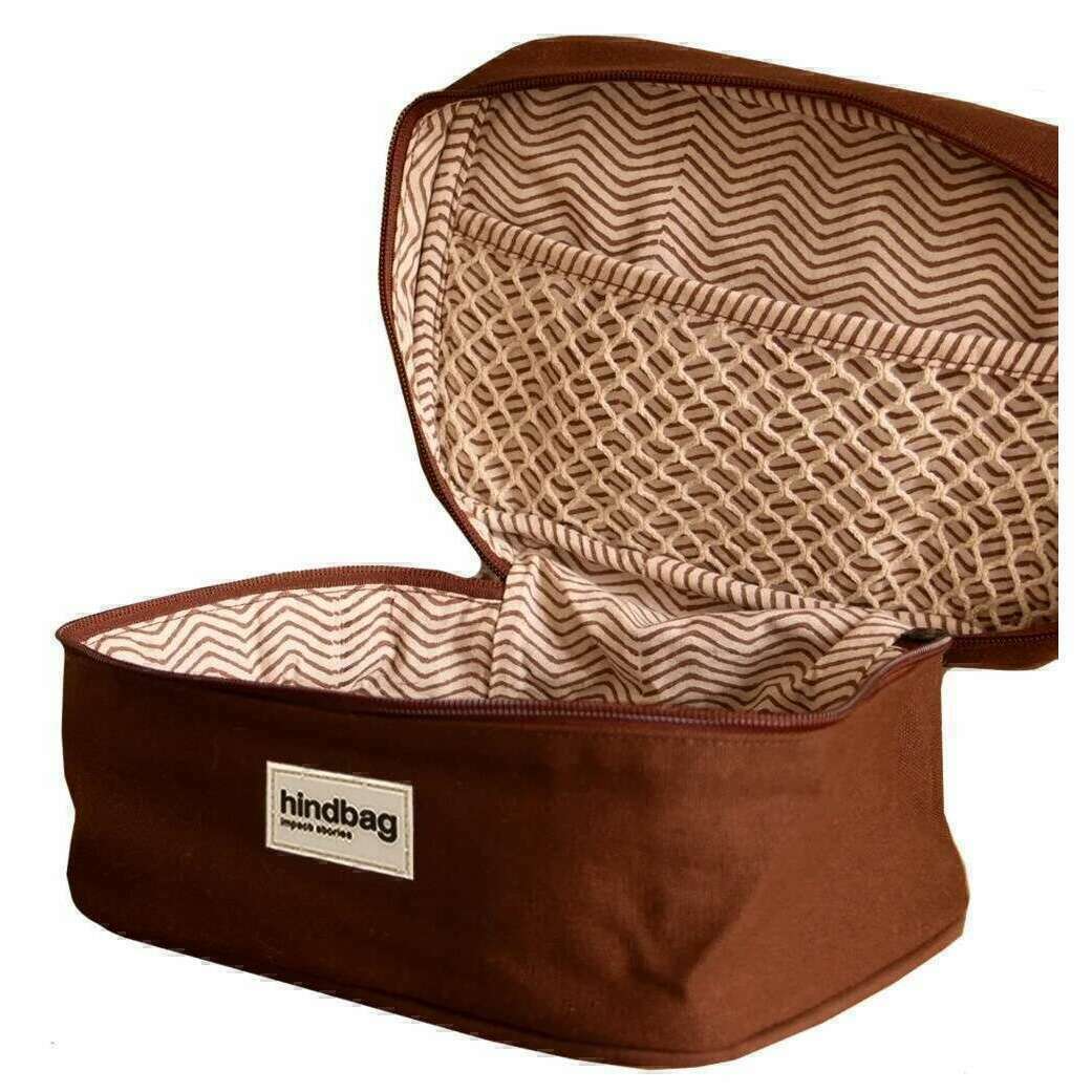 This well made unisex gaspard vanity bag from Hindbag comes in a chocolate brown colour and is manufactured from 100% organic cotton. It measures 13.5cm(height) x 16cm(width) x 25cm(depth). All the bags come complete with hindbag packaging. The Hindbag Gaspard Vanity Bag - Chocolate Brown offers travellers and everyday users alike a convenient and stylish way to keep their toiletries organized and accessible. The interior net is perfect for neatly arranging toiletries, cosmetics, and other personal items. Available in a range of colours, this fashionable accessory represents a harmonious fusion of functionality and aesthetics, catering to those who value both style and practicality in their journey.