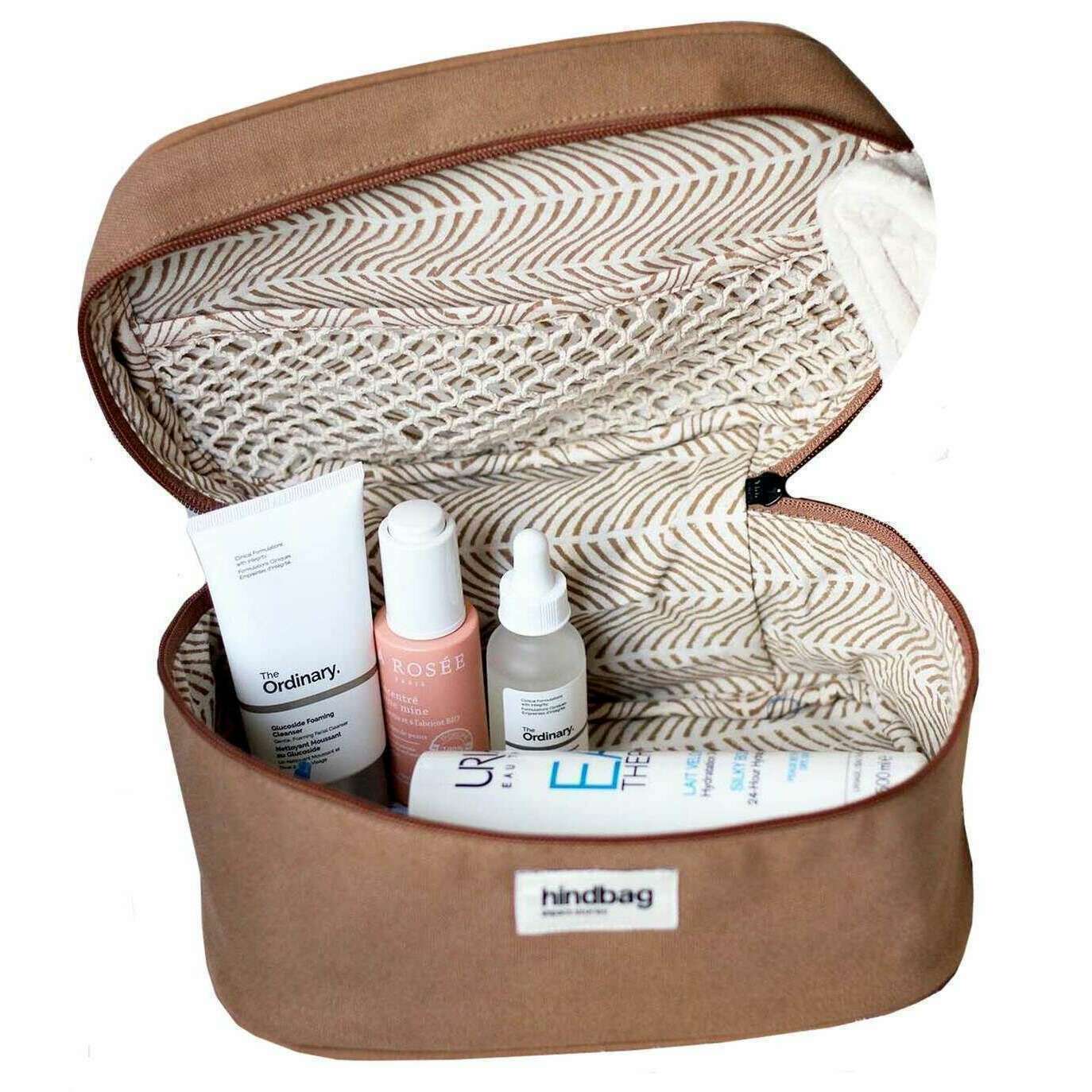 Using brown 100% organic cotton, this gaspard vanity bag by Hindbag is perfect for men or women and a must have. It measures 13.5cm(height) x 16cm(width) x 25cm(depth). All the bags come complete with hindbag packaging. The Hindbag Gaspard Vanity Bag - Cinnamon Brown offers travellers and everyday users alike a convenient and stylish way to keep their toiletries organized and accessible. The interior net is perfect for neatly arranging toiletries, cosmetics, and other personal items. Available in a range of colours, this fashionable accessory represents a harmonious fusion of functionality and aesthetics, catering to those who value both style and practicality in their journey.