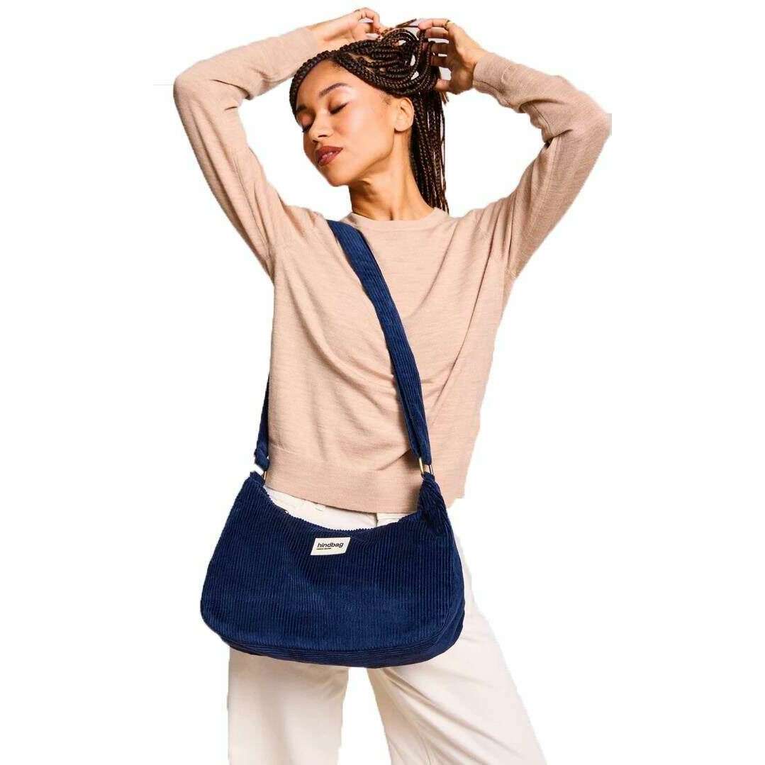 This unisex rosa large shoulder bag by the brand Hindbag is made from 100% organic corduroy and is showcased in navy. It measures 20cm(height) x 34cm(width) x 10cm(depth). All the bags come complete with hindbag packaging. The Hindbag Rosa Large Shoulder Bag - Velvet Navy is an elegant yet playful accessory designed to carry you from the office to brunch with ease. With its adjustable handle, it can be worn over the shoulder, on the shoulder or on the arm. With an inner lining that adds a touch of elegance, this bag features an outside pocket with zipper to have all your essentials close at hand. Ideal for everyday use, this bag is designed for comfort and usability as much as for style.