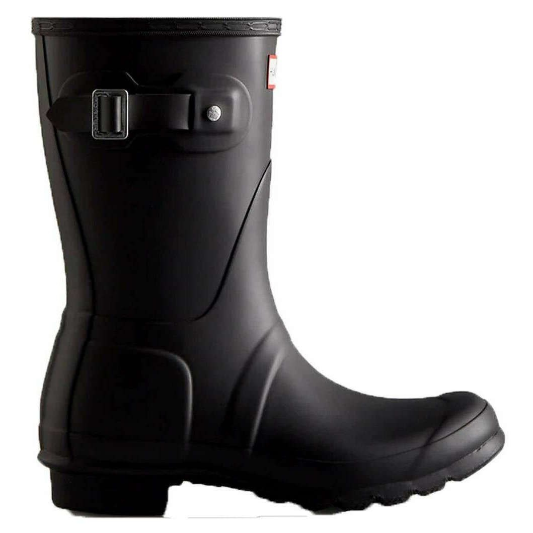 This women's original short wellington boots by the brand Hunter is made from 100% rubber and is showcased in black. All the wellington boots come complete with hunter packaging. The Hunter Original Short Wellington Boots - Black offers a compact version of Hunter s iconic Tall Boot, designed for reliable wet?weather protection. Each pair is handcrafted from 28 natural rubber parts and assembled over three days before being vulcanised for durability and waterproof performance. The boot features a matte finish, the Hunter Original tread pattern, and an updated recycled polyester lining and insole for added comfort. Specially engineered to repel water and prevent moisture seepage, this certified vegan boot is an essential choice for rainy days.