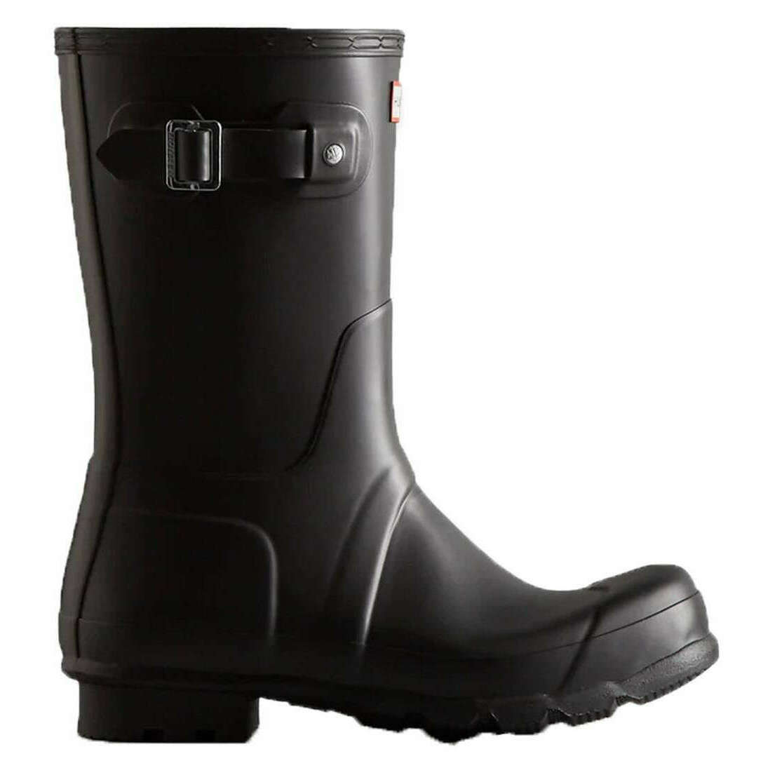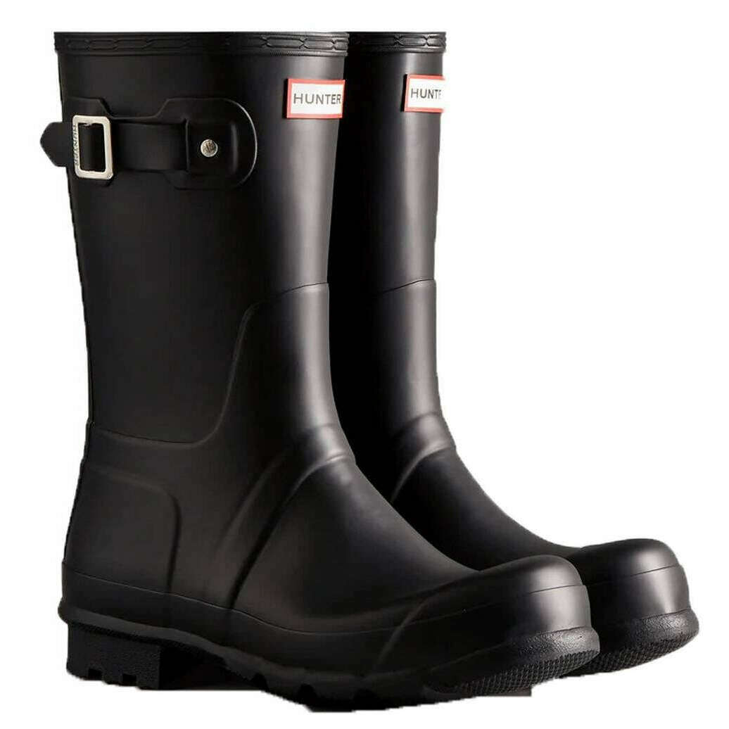 Manufactured from 100% rubber is this black men's original short wellington boots by the designer Hunter. All the wellington boots come complete with hunter packaging. The Hunter Original Short Wellington Boots - Black offers a versatile mid?calf design inspired by Hunter s iconic Tall Boot. It is handcrafted from 28 natural rubber parts and takes over three days to assemble before being vulcanised for durability and waterproof protection. The boot features a matte finish, a comfortable polyester lining, and the Hunter Original tread pattern for reliable grip. Certified vegan and fully waterproof, it provides everyday comfort and classic style.