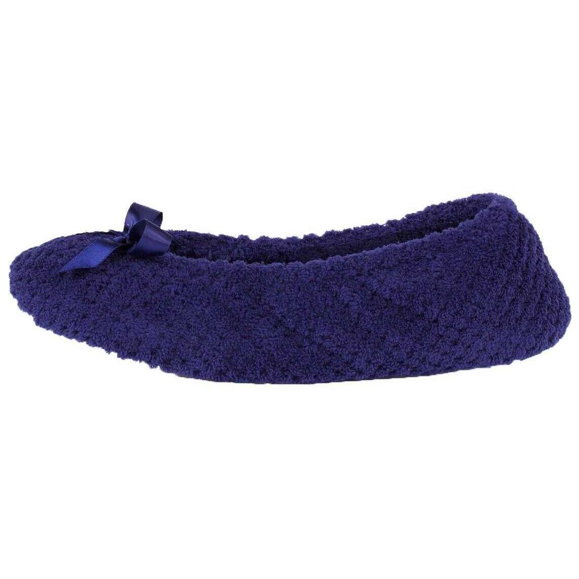 Perfect for women are these Isotoner navy popcorn ballet slippers, they are also made from 100% polyester. Also the navy slippers are designed in a plain pattern, It is recommended to machine wash at 30 degrees to keep these slippers in good condition. All the slippers come complete with isotoner packaging. The Isotoner Popcorn Ballet Slippers - Navy are an essential in any lady s collection. Perfect for walking around the house with an added support, warmth and comfort from the pillow step cushioned technology with a foam layer and a faux suede soft sole. The open top design keeps your feet from overheating leaving a breathable feel whilst the sole leaves a slip-resistant tread. Finished with a girly bow to complete this gorgeous pair.