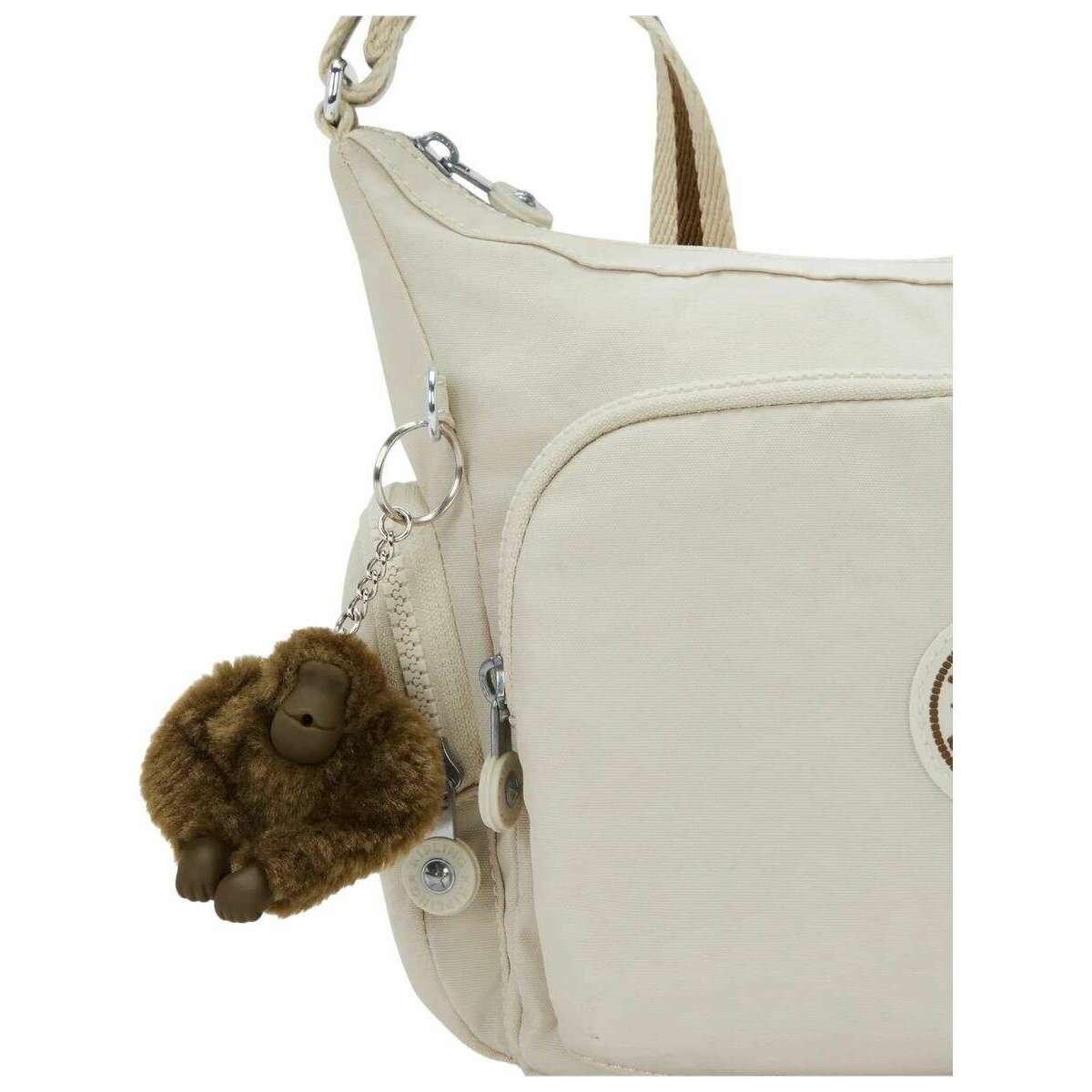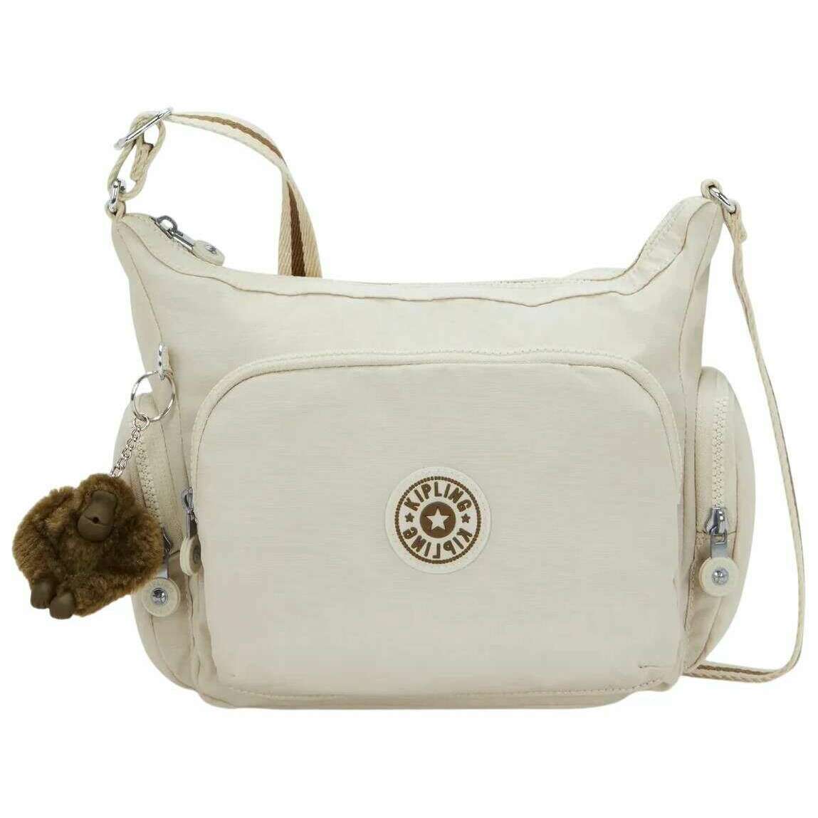 Manufactured from 60% polyamide and 40% recycled polyamide is this soft sand cream women's gabb s medium crossbody bag by the designer Kipling. It measures 22cm(height) x 31cm(width) x 14.5cm(depth). All the bags come complete with kipling packaging. The Kipling Gabb S Medium Crossbody Bag - Soft Sand Cream is designed for those who appreciate effortless organisation and everyday practicality. Complete with a generous selection of inside and outside pockets, it keeps essentials neatly arranged whether running errands, commuting, or exploring on the weekend. The zipped main compartment provides secure storage, while the adjustable strap allows the wearer to switch easily between a classic crossbody or shoulder?bag style for hands?free convenience. Inside, the bag features one open pocket, one zipped pocket, and two pen loops, helping smaller items stay in their place. On the exterior, a zipped front pocket, a zipped back pocket, and two zipped side pockets offer quick?access storage for items needed throughout the day. A key leash ensures that keys can be found quickly and easily. As a smaller version of the popular Gabb, it delivers the same trusted functionality in a more compact silhouette. Finished with the round Kipling logo and the signature Kipling monkey keychain, the Gabb S is a dependable, stylish, and versatile companion for daily adventures.