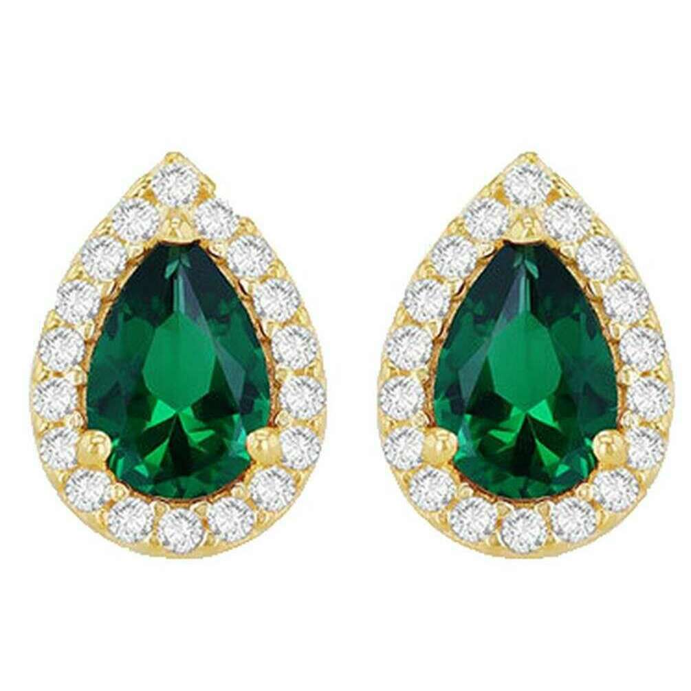 KJ Beckett Pear Shaped Halo Stud Earring - Yellow Gold/Green