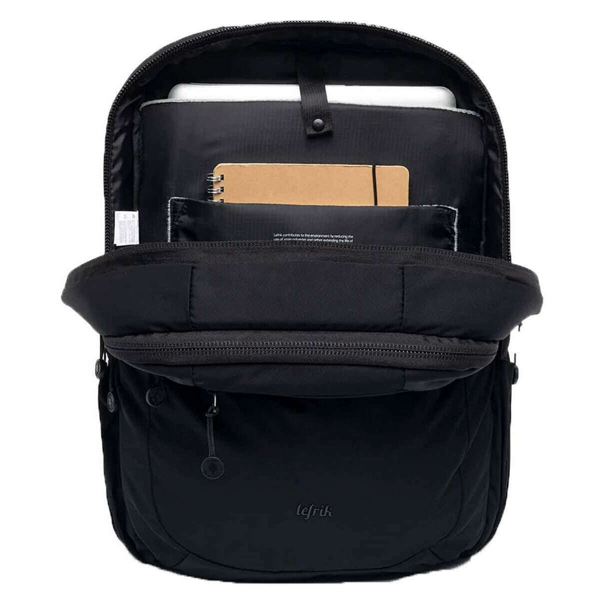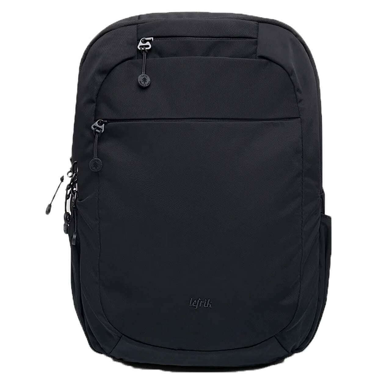 Designer Lefrik has brought you this unisex 100% ultra lightweight fabric bag using black tones. It measures 40cm(height) x 25cm(width) x 12cm(depth). All the bags come complete with lefrik packaging. The Lefrik 101 Backpack - Black is a sleek, sustainable, and practical choice for daily commuting and business travel. Crafted from recycled plastic bottles, this backpack features a main compartment with padded sleeve that holds up to 15.6" laptops, tablets and daily essentials. For efficient organization, this bag has two quick-access zipped pockets, one on the top and one on the front. With padded back and handles for comfort, this backpack can be attached to the handle of a trolley suitcase to keep it secure on your trips.