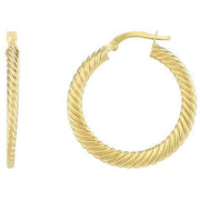 These fine twist hoop earrings for women are fashioned by the brand Mark Milton in a gold colour and are made from 9ct gold. It measures 2.6cm(height) x 0.2cm(width) x 0.4cm(depth). All the earrings come complete with mark milton packaging. The Mark Milton Fine Twist Hoop Earrings - Yellow Gold are a must-have to add to your earring rotation with its unique gold textured twist design. Perfect for matching with your style whatever the occasion. These make for the perfect gift for yourself or someone else!