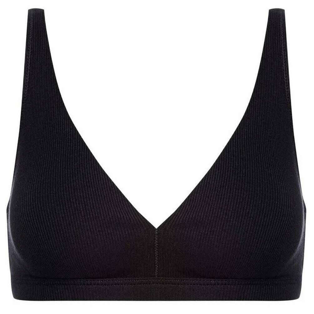 Manufactured from 89% cotton and 11% elastane is this black women's organic cotton triangle bra by the designer Mey. Also the black underwear is designed in a plain pattern, It is recommended to machine wash at 40 degrees to keep this underwear in good condition. All the underwear comes complete with mey packaging. The Mey Organic Cotton Triangle Bra - Black ensures you enjoy natural comfort with this wire?free bra featuring removable pads, a secure rubber band, and a three?way adjustable hook?and?eye closure. Wide, adjustable straps provide extra support, making it perfect for everyday wear. Soft, simple, and effortlessly comfortable.