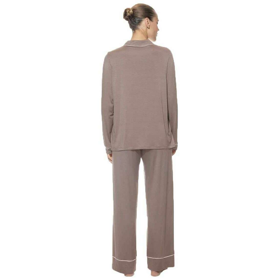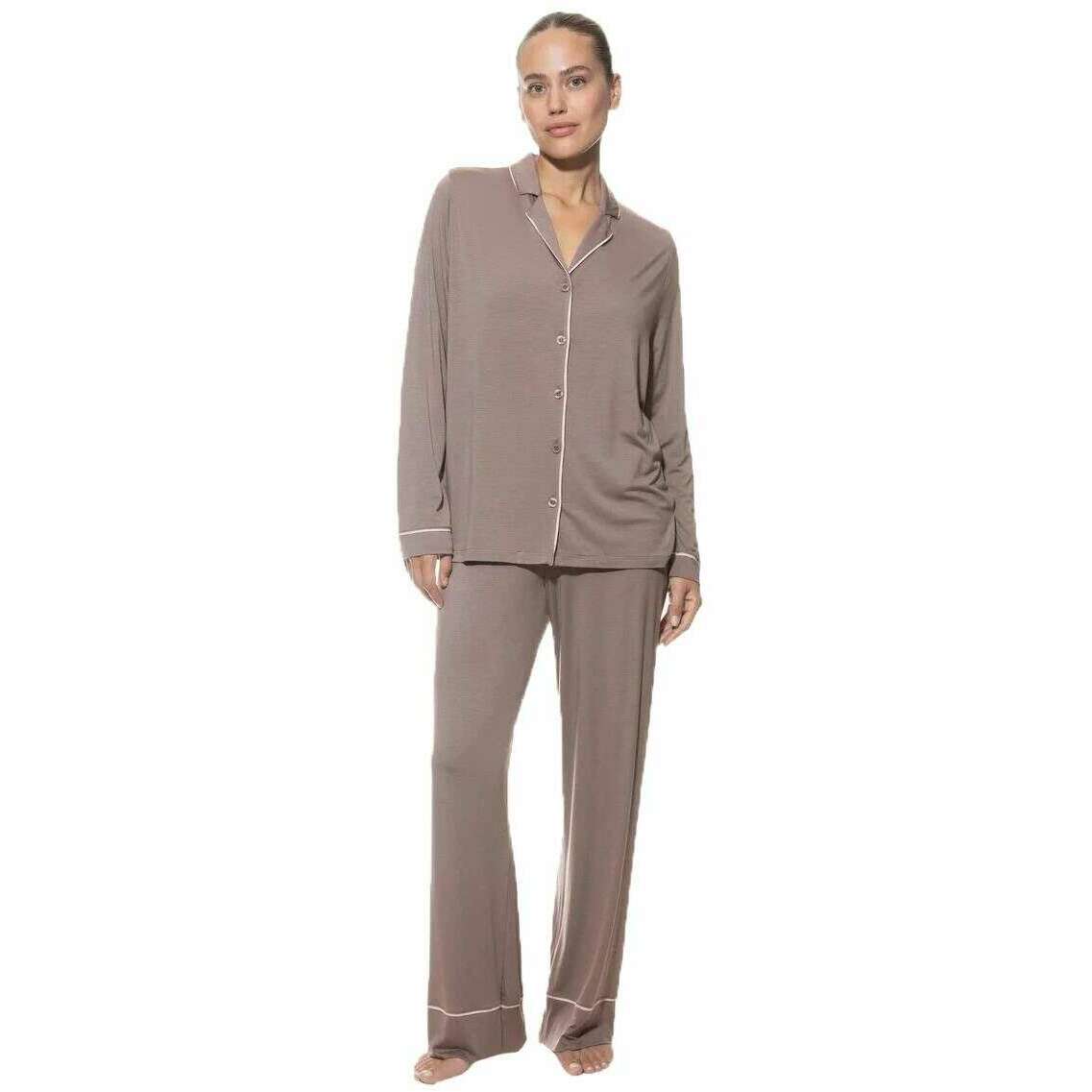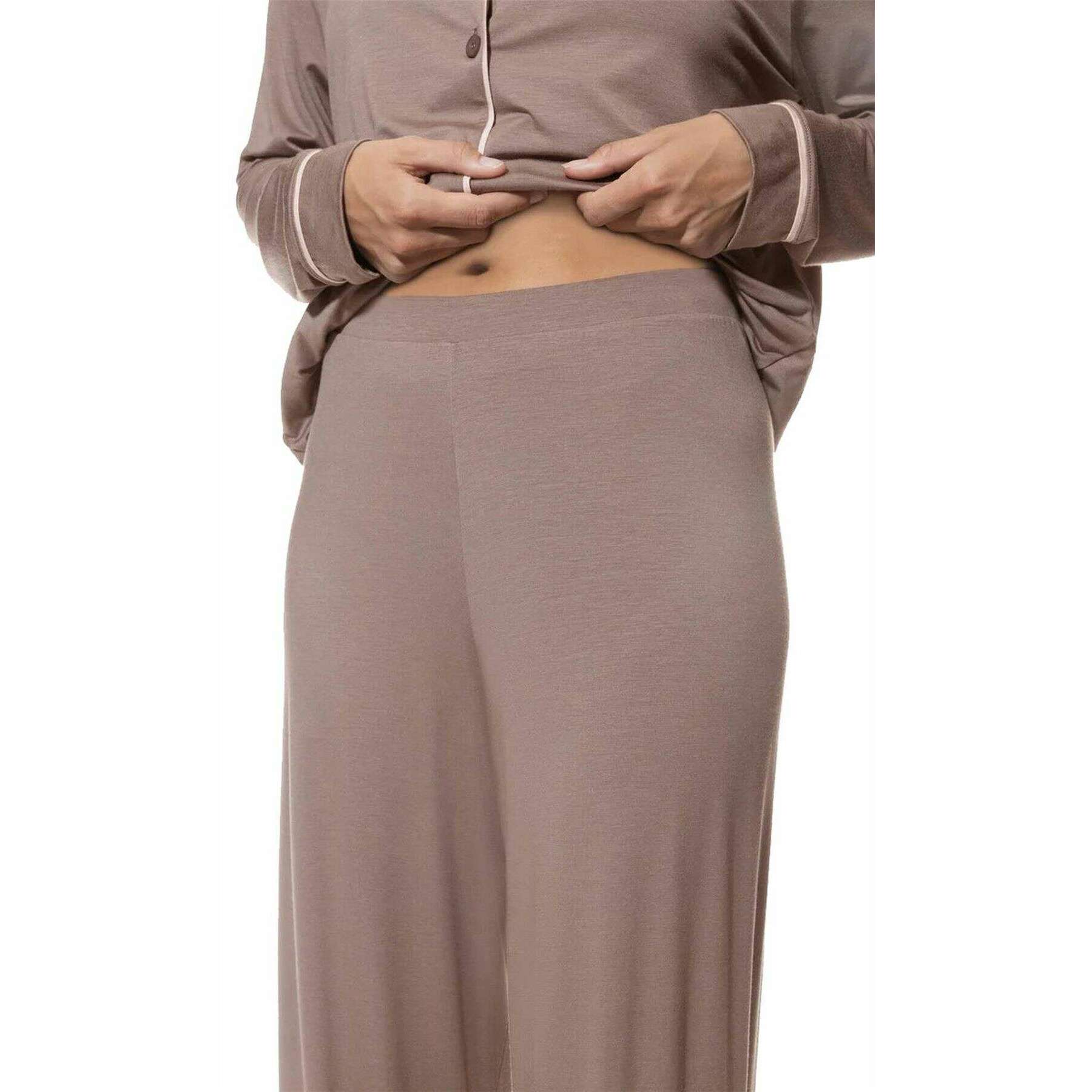 Brought to you by the brand Mey, these milk n coffee beige women's pure chic full length pyjamas are made from 94% modal and 6% elastane. Also the milk n coffee beige pyjamas are designed in a plain pattern, Mey have made these pure chic full length pyjamas in Portugal. It is recommended to machine wash at 40 degrees on a gentle cycle, not suitable for tumble drying to keep these pyjamas in good condition. All the pyjamas come complete in mey packaging. The Mey Pure Chic Full Length Pyjamas - Milk n Coffee Beige will certainly elevate your loungewear to keep you looking stylish whilst very comfortable, adding a bit of luxury to your down time. Crafted from modal and elastane ensure warmth whilst being breathable and a skin-friendly wear. The wide leg fit allows freedom of movement and a non-restrictive wear whilst the elastic waistband with adjustable drawstring allows for the perfect fit. This shirt is fully buttoned with a reversible collar and long sleeved. Completing this set is the decorative piping details.