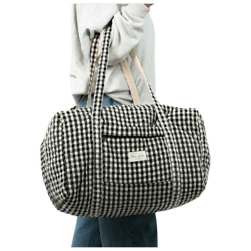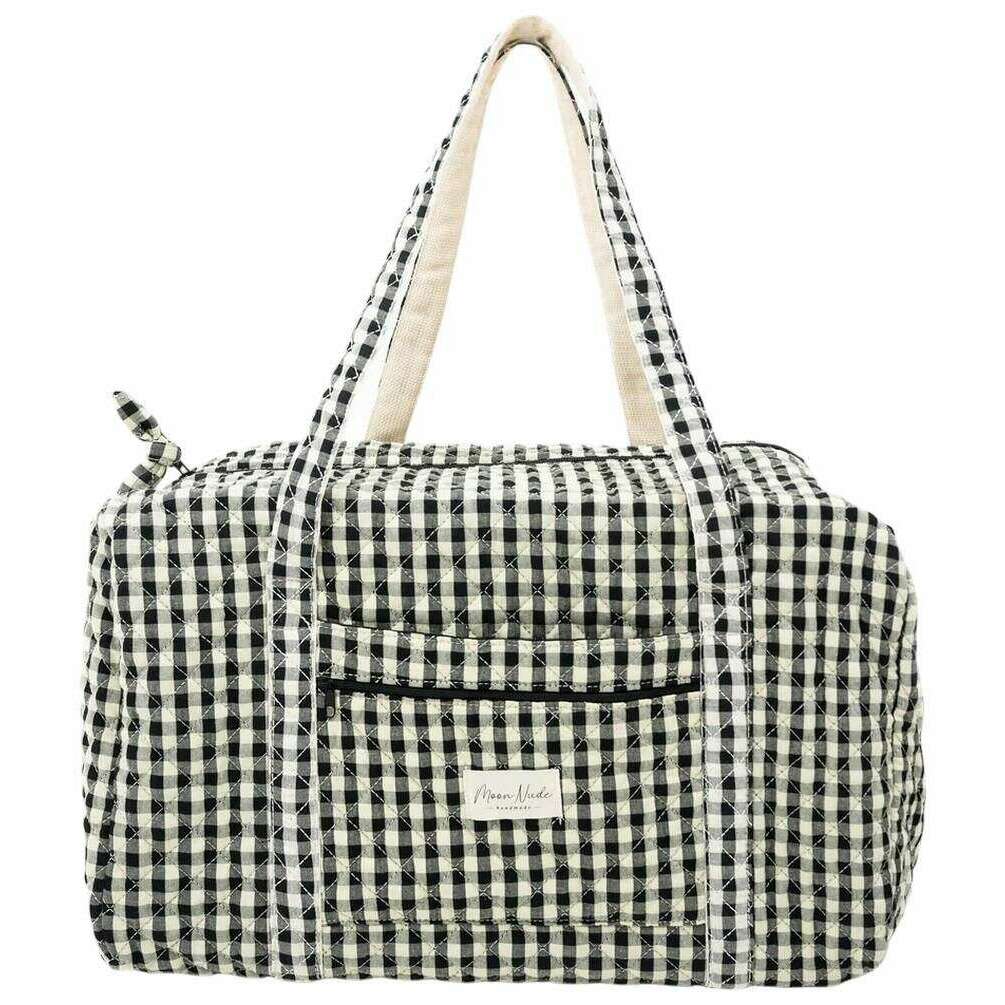 This women's classic large duffel bag by the brand Moon Nude is made from 100% cotton and is showcased in black. It measures 30cm(height) x 50cm(width) x 28cm(depth). It is recommended to wash by hand in cold water with a mild detergent, or maching wash inside out on a delicate cycle. to keep this bag in good condition. All the bags come complete with moon nude packaging. The Moon Nude Classic Large Duffel Bag - Black/White features a beautiful handmade quilted design. This bag features an exterior zip pocket, a spacious interior and two large handles, perfect for weekend getaways or carrying lots of belongings.
