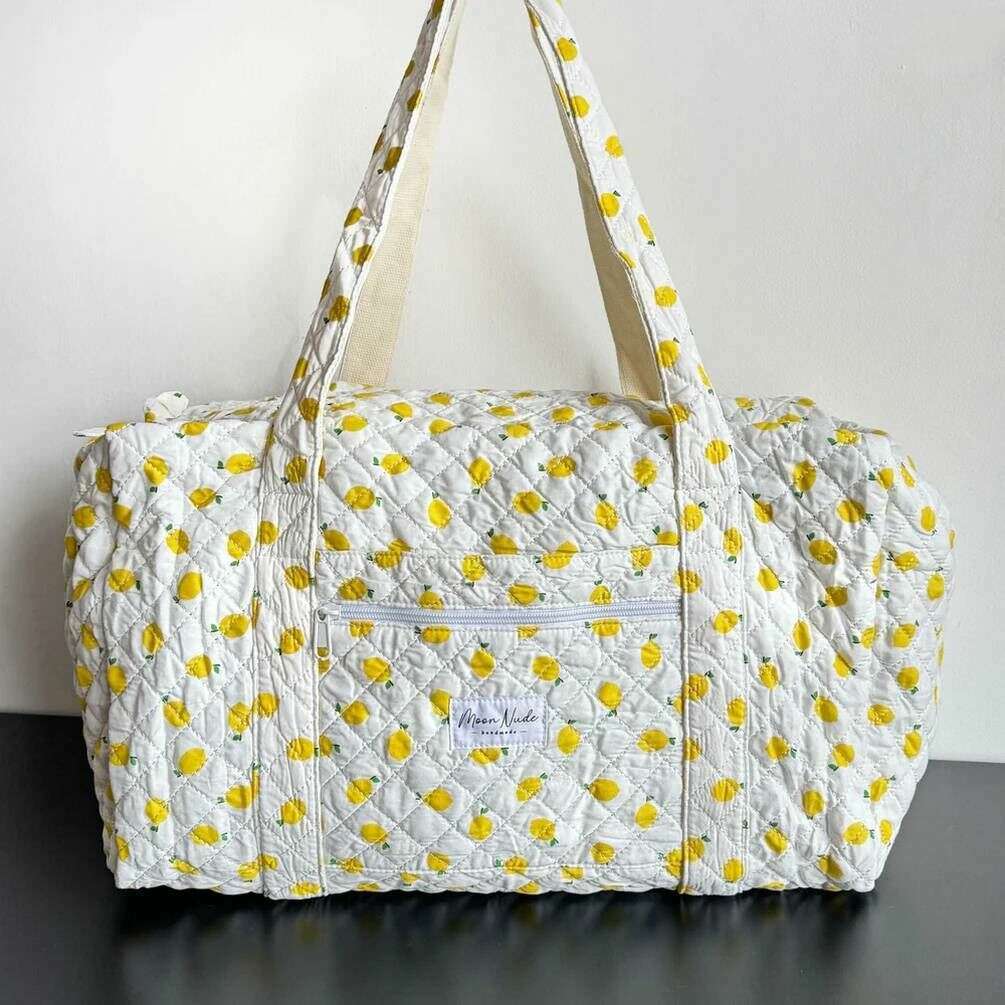 Perfect for women is this Moon Nude white/yellow lemonade large duffel bag, it is also made from 100% cotton. It measures 30cm(height) x 50cm(width) x 28cm(depth). It is recommended to wash by hand in cold water with a mild detergent, or maching wash inside out on a delicate cycle. to keep this bag in good condition. All the bags come complete with moon nude packaging. The Moon Nude Lemonade Large Duffel Bag - White/Yellow features a beautiful handmade quilted design. This bag features an exterior zip pocket, a spacious interior and two large handles, perfect for weekend getaways or carrying lots of belongings.