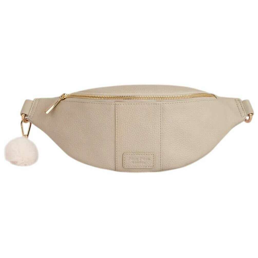 This women's bum bag has been made from 100% full-grain leather, featured in a beige colour and is from the brand Pom Pom London. It measures 12cm(height) x 33cm(width) x 11cm(depth). All the bags come complete with pom pom london packaging. The Pom Pom London Bum Bag - Stone is designed for anyone seeking a stylish, hands?free option that doesn t compromise on elegance. Its sleek silhouette and modern appeal make it the perfect accessory for days on the move, travel adventures, or everyday errands. Crafted from full?grain leather, it delivers both durability and a luxurious finish. The bag features a versatile nylon strap that can be adjusted for a comfortable and personalised fit, whether worn around the waist or styled crossbody. For practical organisation, it includes a separate external zipped compartment that provides quick access to essentials, as well as an internal zip pocket designed to keep valuables secure and neatly arranged. Finishing the look, Pom Pom London s signature gold hardware adds a touch of iconic elegance that elevates this everyday essential.