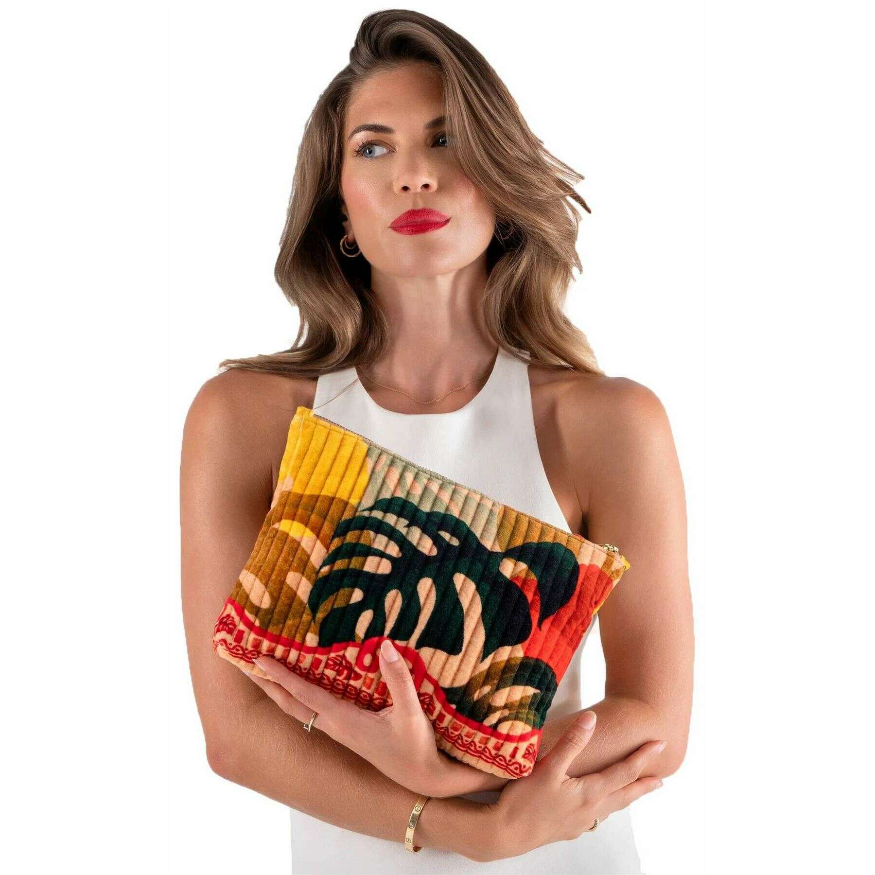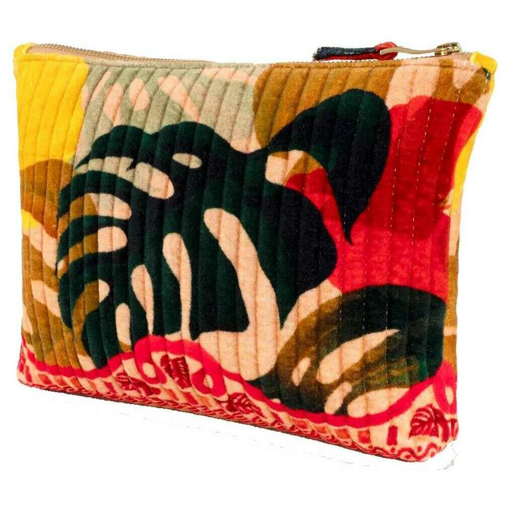 Powder Exotic Leaves Quilted Velvet Zip Pouch - Beige/Red/Black