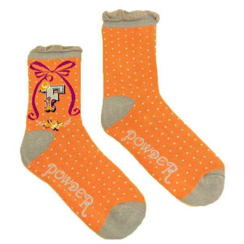 These women's letter f ankle socks have been made from 65% bamboo, 15% cotton, 10% nylon and 10% elastane, featured in a orange colour and are from the brand Powder. Also the satsuma orange socks are designed in a spots pattern, It is recommended to machine wash at 30 degrees to keep these socks in good condition. All the socks come complete with powder tags. The Powder Letter F Ankle Socks - Satsuma Orange are the perfect socks for a personalised gift! Made using bamboo these socks will keep your feet stylish and warm. Available with every letter of the alphabet these socks have a fun, playful design that you are sure to love!