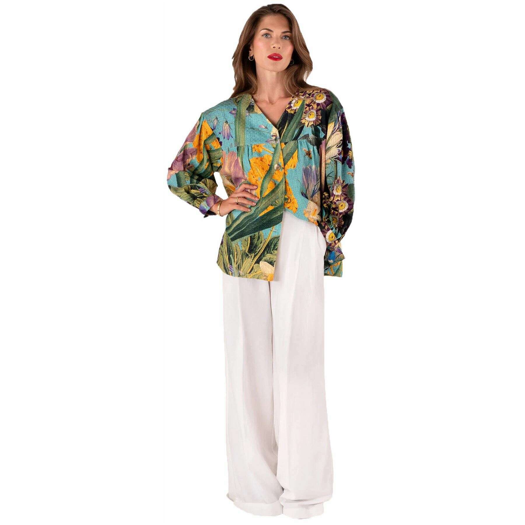 • Hemmed Sleeves , Button Up , V-Neck Collar