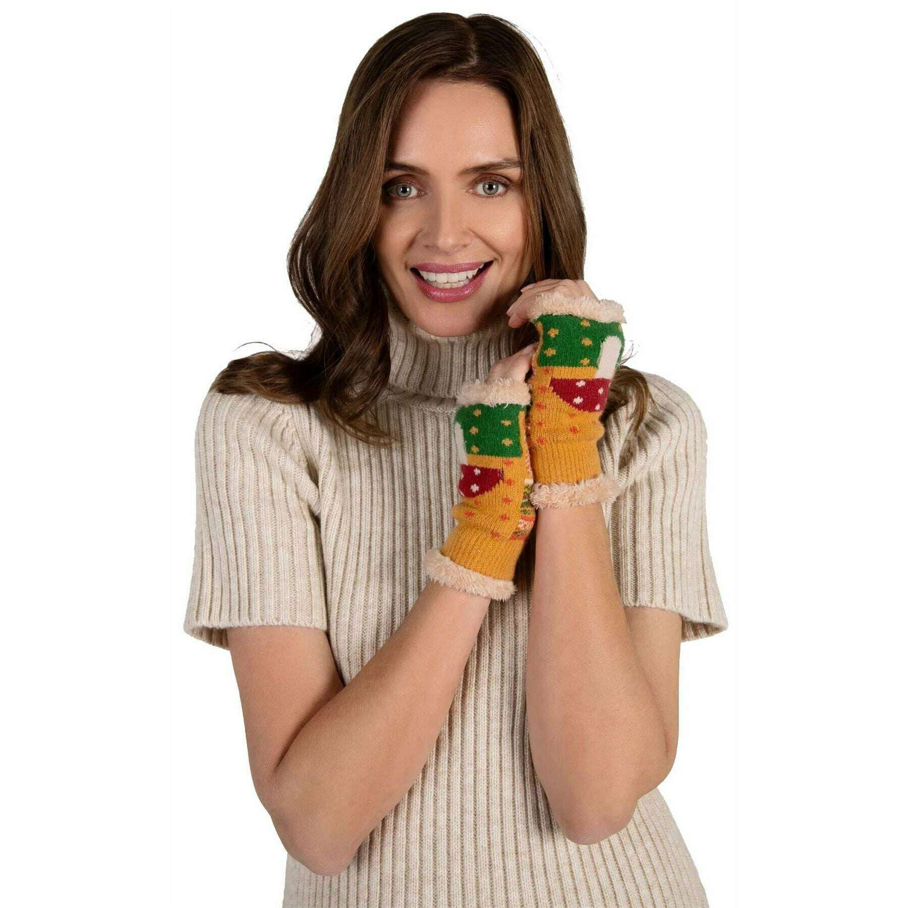 Introducing these women's toadstool wrist warmers by Powder, they are manufactured from 52% acrylic, 28% nylon and 20% polyester in a mustard yellow colour. It measures 18cm(height) x 10cm(width). Also the mustard yellow gloves are designed in a unique pattern, It is recommended to hand wash only to keep these gloves in good condition. All the gloves come complete with powder tags. The Powder Toadstool Wrist Warmers - Mustard Yellow are a great way to add a pop of colour to dark and gloomy winter days and nights. Due to the open top, you are free to use your phone whilst still keeping your hands and wrists warm and toasty as the ribbed elasticated top and bottom ensures heat is kept in.