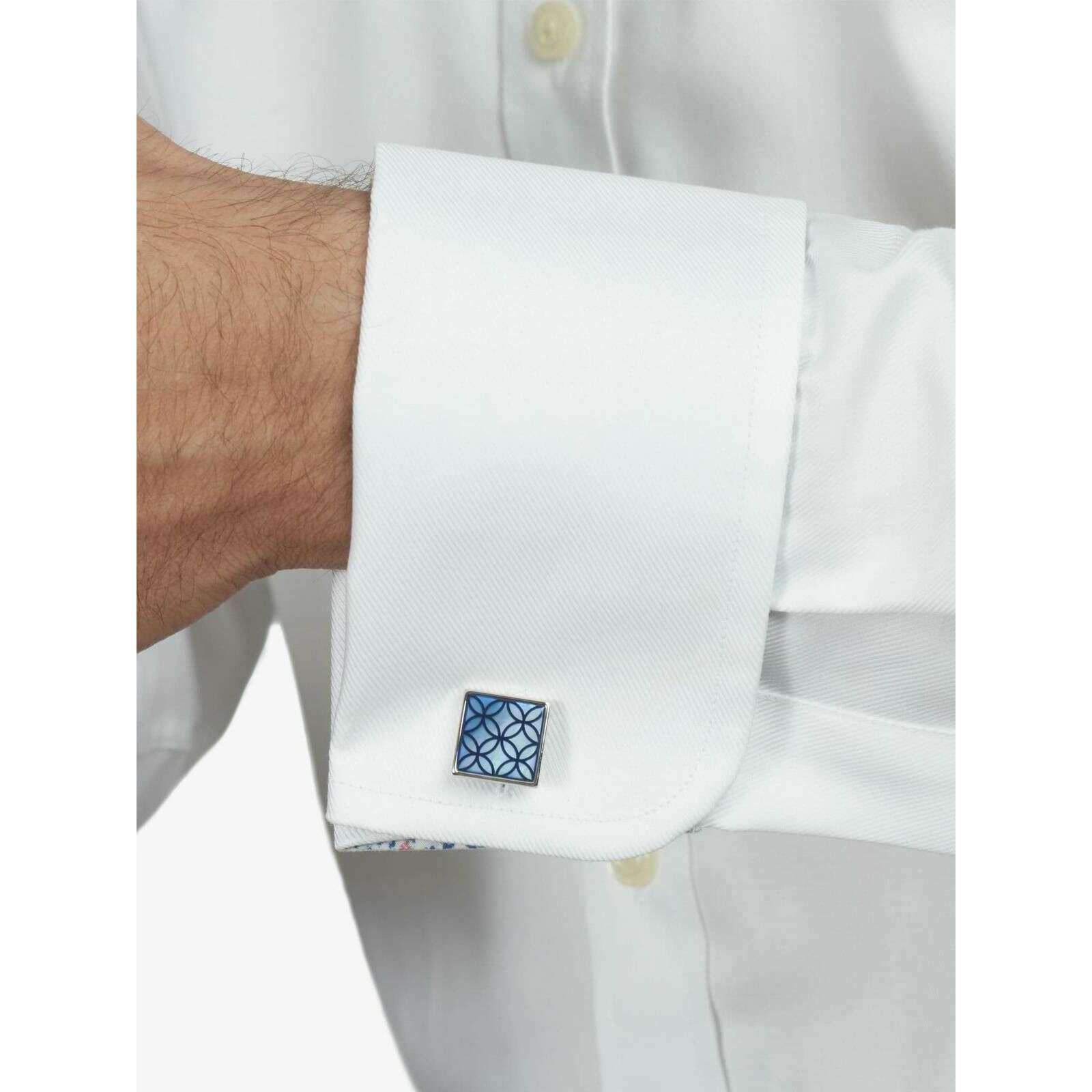 Manufactured from rhodium plated metal and mother of pearl are these blue/silver men's geo petal mother of pearl cufflinks by the designer Simon Carter. All the cufflinks come complete with simon carter packaging. The Simon Carter Geo Petal Mother of Pearl Cufflinks - Blue/Silver feature an elegant tile like design over blue mother of pearl stone. This set of cufflinks are the perfect finishing touch for any formal occasion and make a great gift for all gentlemen!