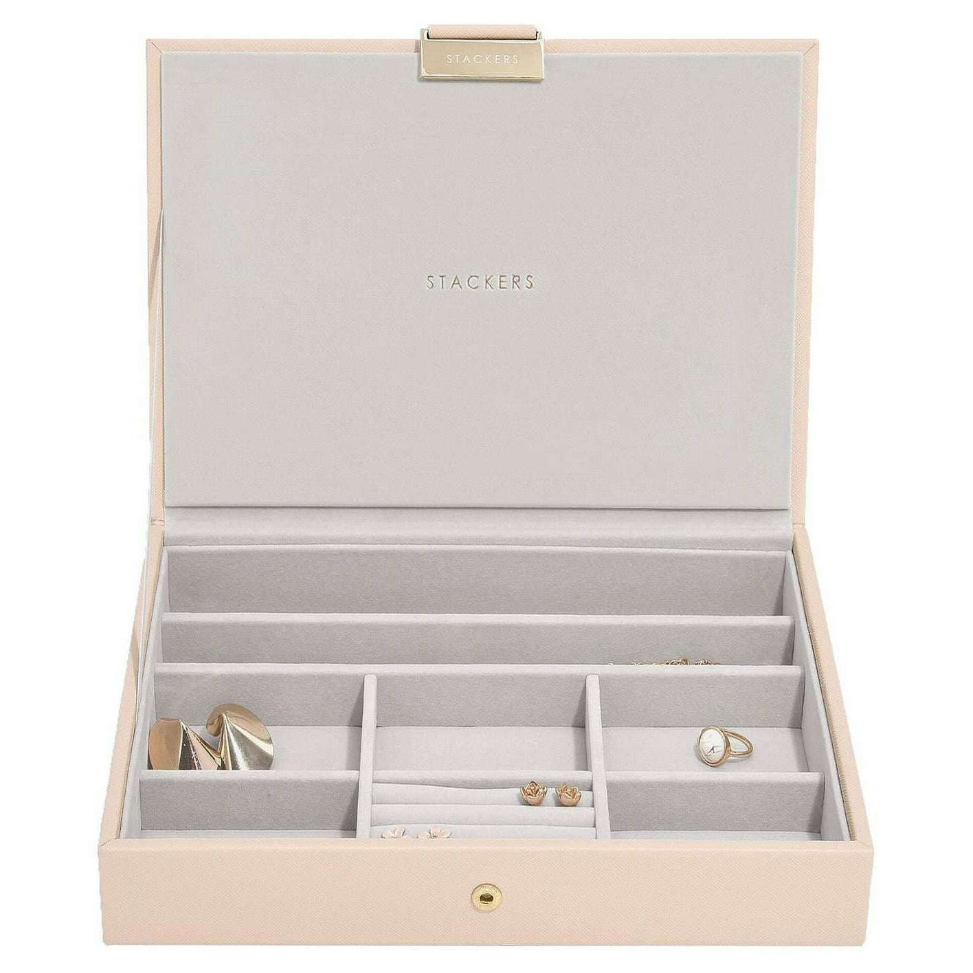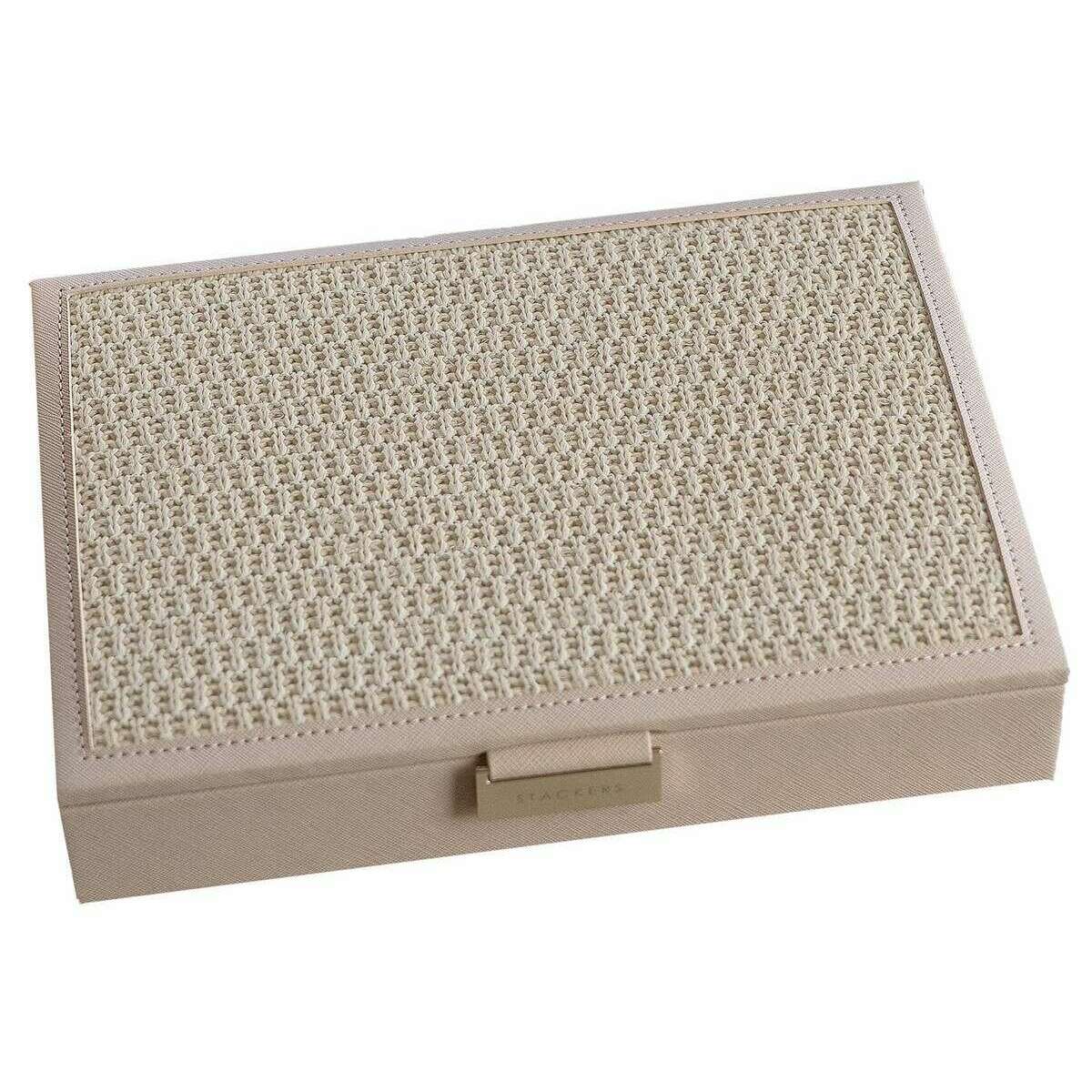 Using pink faux leather and velvet, this classic jewellery box lid by Stackers is perfect for women and a must have. It measures 4.7cm(height) x 25cm(width) x 18cm(depth). All the jewellery boxes come complete with stackers packaging. The Stackers Classic Jewellery Box Lid - Blush Pink Raffia features a beautiful pink raffia design. This jewellery box lid is perfect for storing all your jewellery items! Comes complete with multiple sized sections for rings, earrings, bracelets and necklaces.