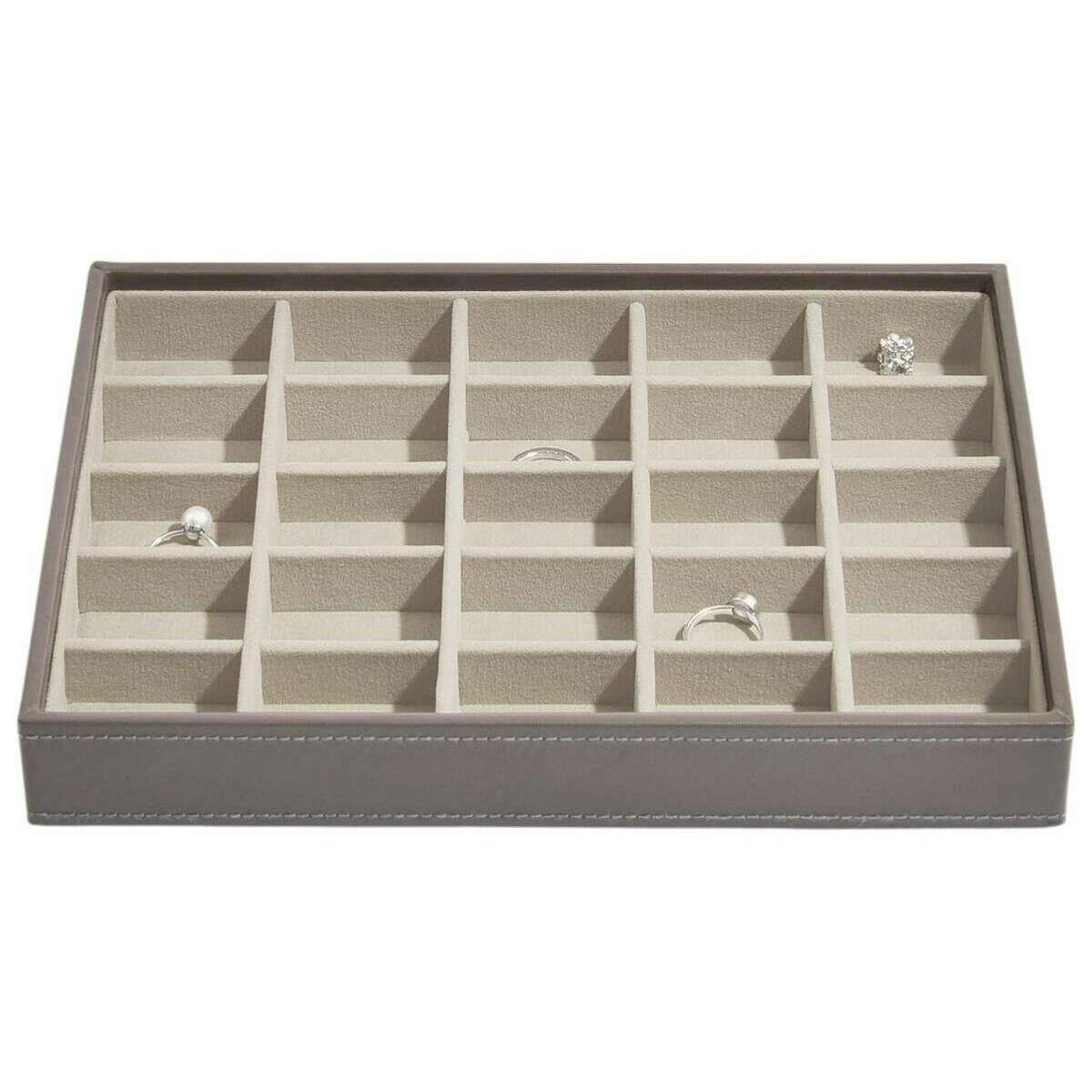 This well made women's classic jewellery box set of 4 from Stackers comes in a mink brown colour and is manufactured from faux leather and velvet. It measures 19.5cm(height) x 25cm(width) x 18cm(depth). It is recommended to wipe clean to keep this jewellery box in good condition. All the jewellery boxes come complete with stackers packaging. The Stackers Classic Jewellery Box set of 4 - Mink Brown is certain to impress with its unbelievable amount of space. Featuring a top lidded section for those precious little pieces, a middle 25 section tray for those charms or rings, another middle tray with three sections to hold your bracelets and necklaces with ring rolls to store more rings and earrings, and then the bottom is a deep three section box for those larger items like big bracelets, watches and sunglasses. Make this the most ideal jewellery box you can own with it offering so much in the most luxurious way.