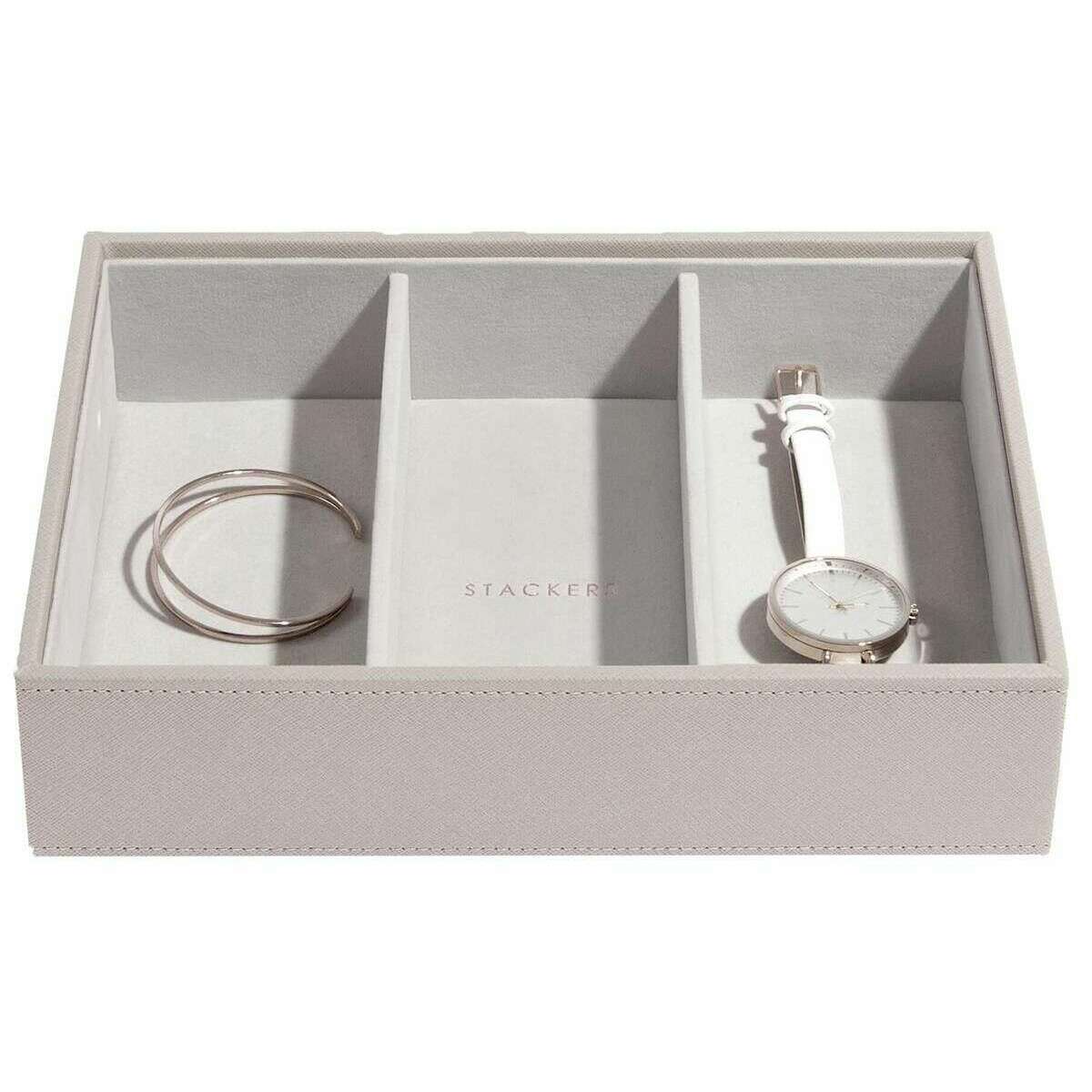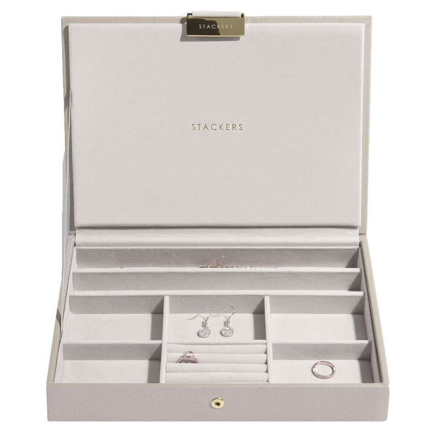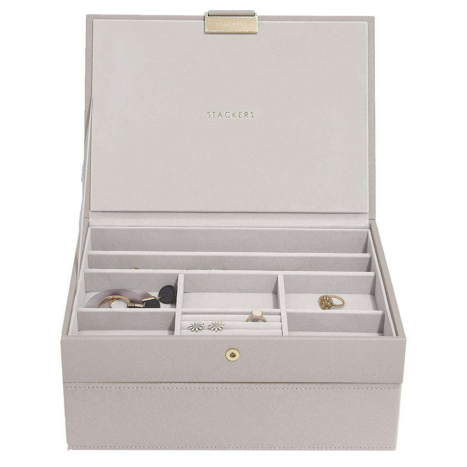 Manufactured from faux leather and velvet is this taupe raffia women's classic set of 2 jewellery box by the designer Stackers. It measures 11cm(height) x 25cm(width) x 18cm(depth). All the jewellery boxes come complete with stackers packaging. The Stackers Classic Set of 2 Jewellery Box - Taupe Raffia features a unique taupe raffia jewellery box design. This jewellery box is perfect for storing all your jewellery items! Comes complete with two layers and multiple sized sections for earrings and bracelets and a larger section for watches and bangles.