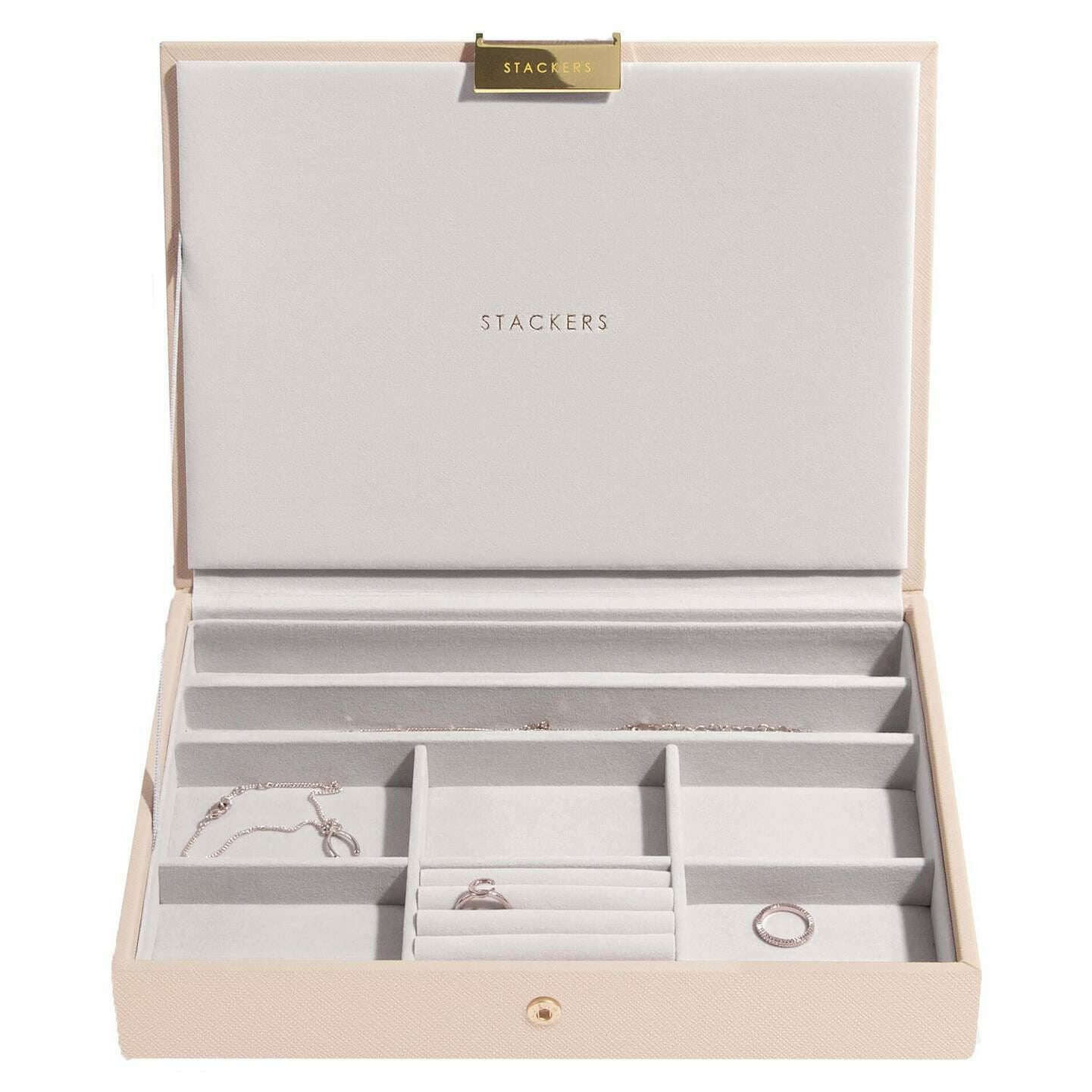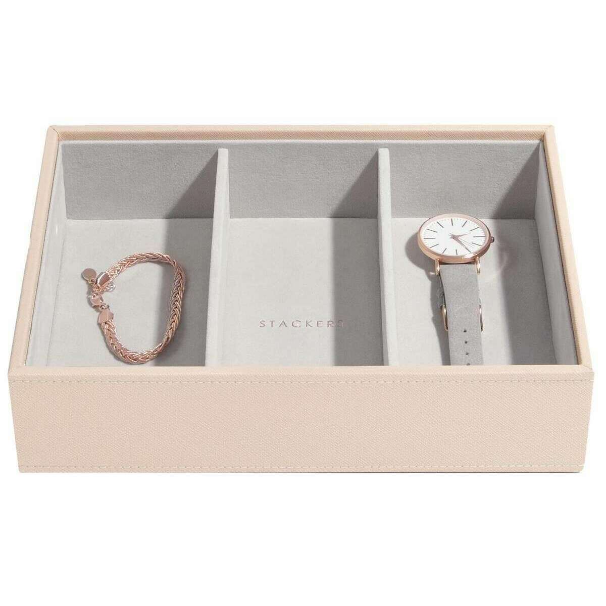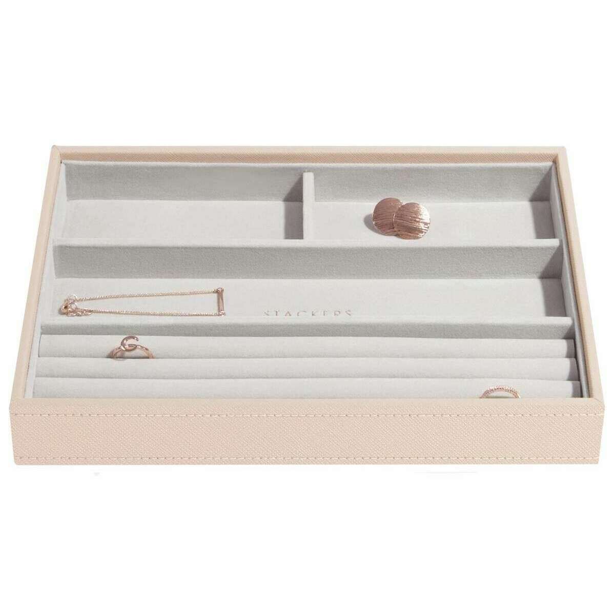 This women's classic set of 4 jewellery box has been made from faux leather and velvet, featured in a pink colour and is from the brand Stackers. It measures 19.5cm(height) x 25cm(width) x 18cm(depth). All the jewellery boxes come complete with stackers packaging. The Stackers Classic Set of 4 Jewellery Box - Blush Pink Raffia features a unique pink raffia jewellery box design. This jewellery box is perfect for storing all your jewellery items! Comes complete with four layers and multiple sized sections for earrings, rings and bracelets and a larger section for watches and bangles.