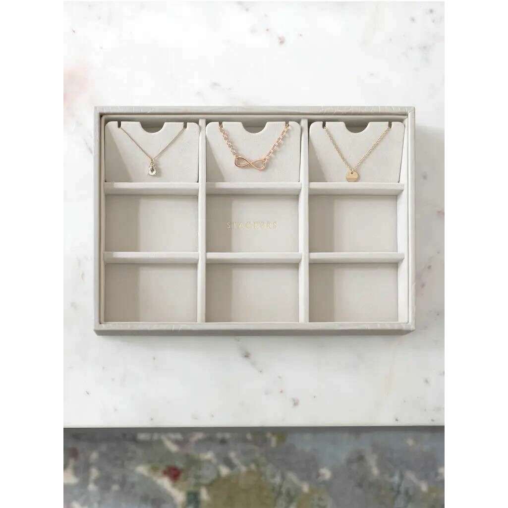 This classic statement layer for women is fashioned by the brand Stackers in a grey colour and is made from faux leather and velvet. It measures 3.7cm(height) x 25cm(width) x 18cm(depth). It is recommended to wipe clean to keep this jewellery box in good condition. All the jewellery boxes come complete with stackers packaging. The Stackers Classic Statement Layer - Putty Grey has been cleverly created and designed to hold all of your earrings, rings or hair clips perfectly. It can be added to any other classic jewellery tray to create a jewellery box or it can be used on its own. You won't have to compromise on organisation.