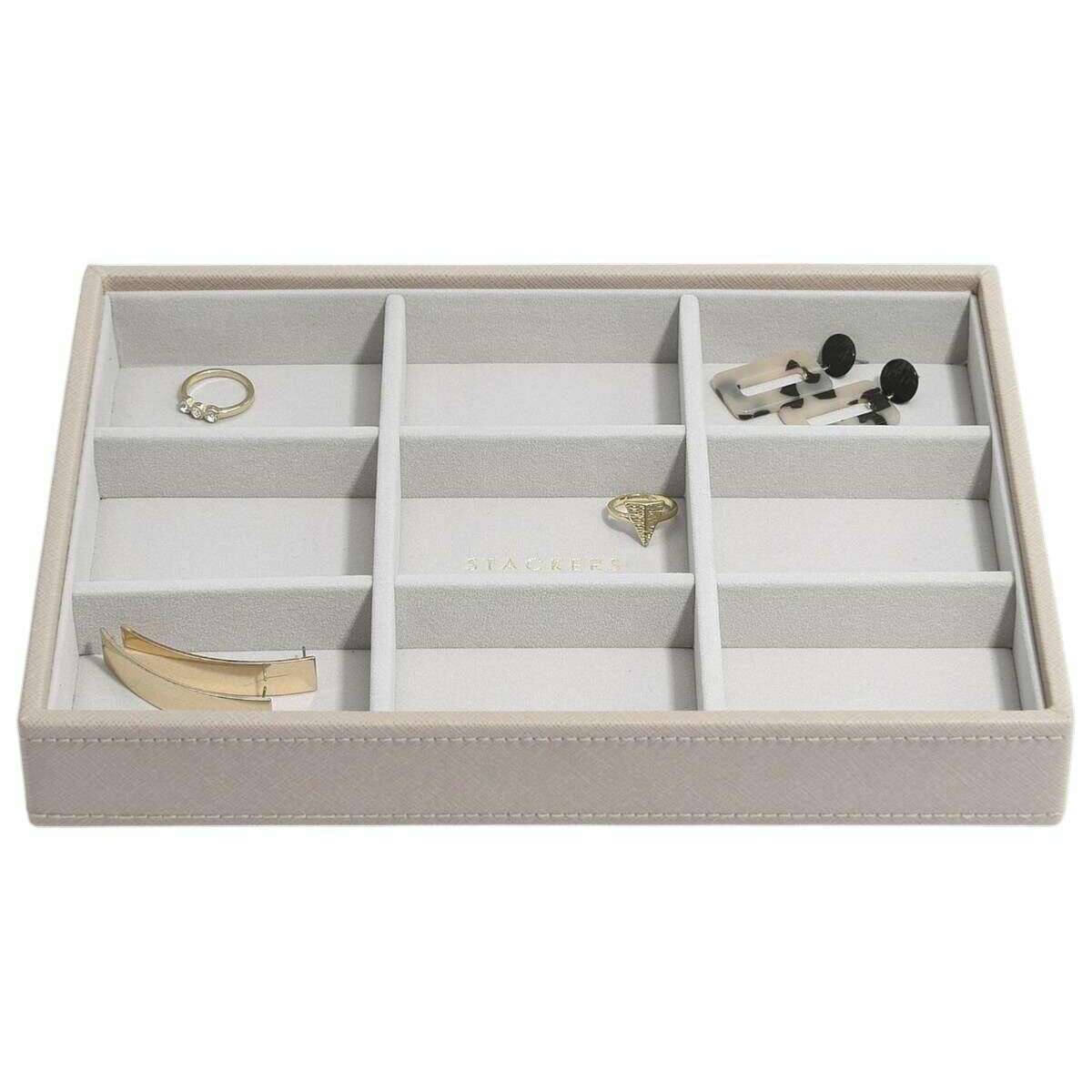 Perfect for women is this Stackers taupe beige classic statement layer, it is also made from faux leather and velvet. It measures 3.7cm(height) x 25cm(width) x 18cm(depth). It is recommended to wipe clean to keep this jewellery box in good condition. All the jewellery boxes come complete with stackers packaging. The Stackers Classic Statement Layer - Taupe Beige has been cleverly created and designed to hold all of your earrings, rings or hair clips perfectly. It can be added to any other classic jewellery tray to create a jewellery box or it can be used on its own. You won't have to compromise on organisation.