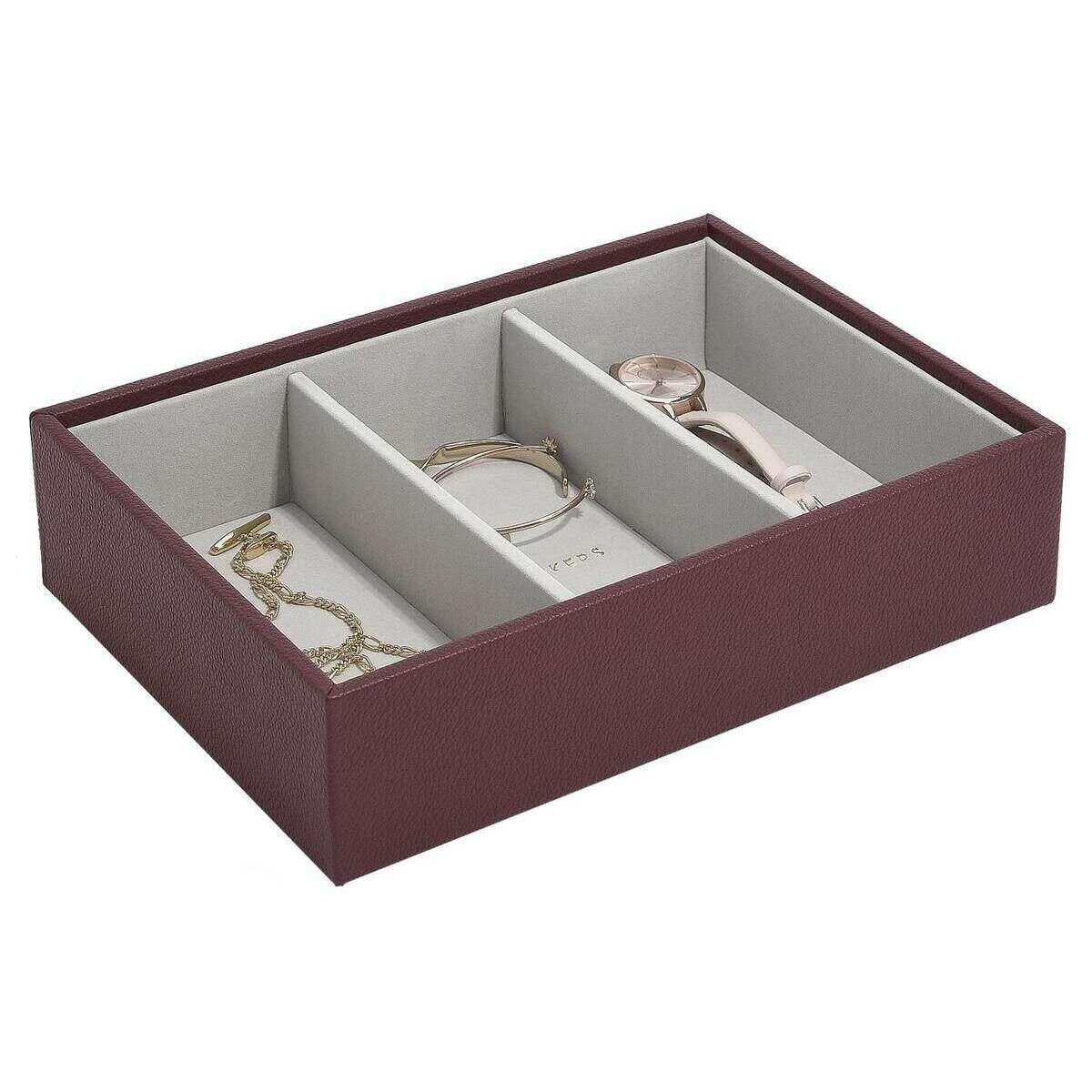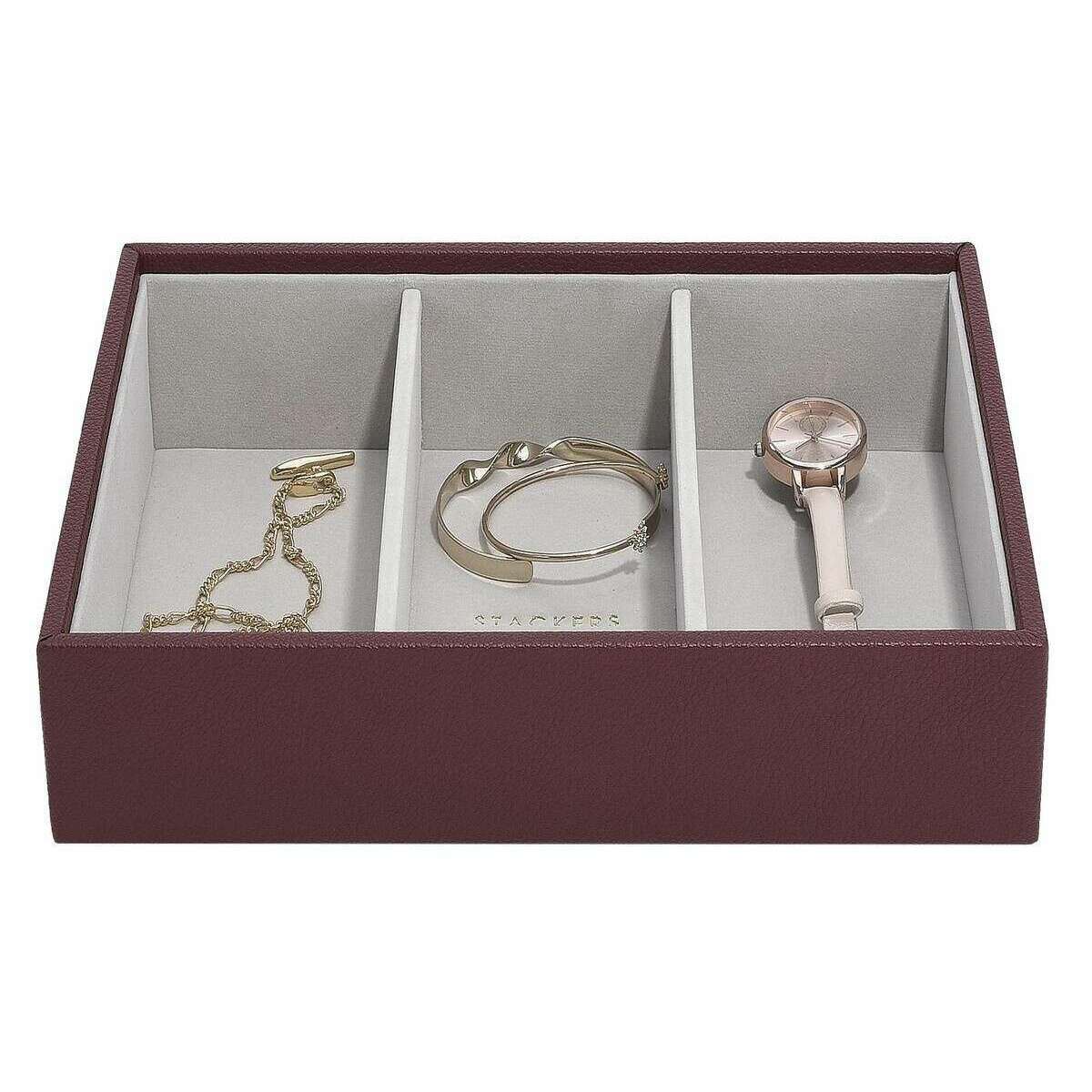 Using burgundy faux leather and velvet, this classic watch accessory layer by Stackers is perfect for women and a must have. It measures 6cm(height) x 25cm(width) x 18cm(depth). All the jewellery boxes come complete with stackers packaging. The Stackers Classic Watch Accessory Layer - Burgundy features three bigger sections for any of your larger jewellery items. This beautiful burgundy jewellery layer is perfect for storing bigger items like sunglasses, watches and bangles.