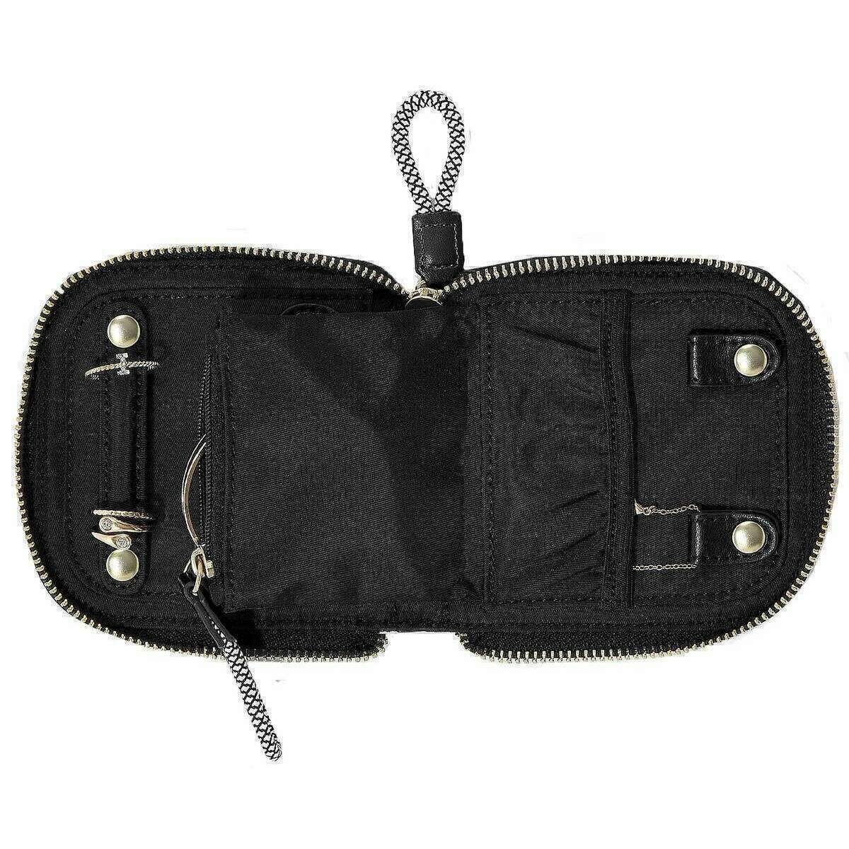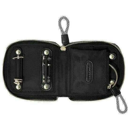 Brought to you by the brand Stackers, this black women's compact jewellery roll is made from recycled nylon. It measures 11.1cm(height) x 11.1cm(width) x 2.4cm(depth). All the jewellery boxes come complete in stackers packaging. The Stackers Compact Jewellery Roll - Black perfect for your travels whether that’s a short weekend away, a longer vacation, or just for your gym bag. This case has space for up to 4 pairs of earrings, a few rings, 2 necklaces, and a few trinkets with its sweet small zipper pouch in the middle. The zipper closure ensures security and a worry-free mindset knowing your jewellery and accessories are safe.