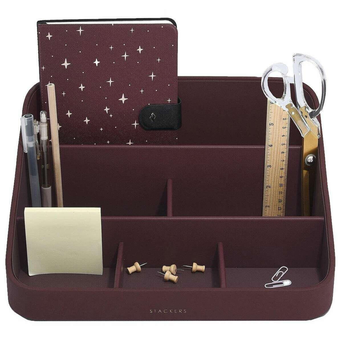 Manufactured from faux leather is this garnet burgundy women's desk organiser by the designer Stackers. It measures 14.5cm(height) x 24.5cm(width) x 32.5cm(depth). All the desk accessories come complete with stackers packaging. The Stackers Desk Organiser - Garnet Burgundy features a beautiful burgundy design. This desk organiser has many sections for stationary, notebooks and many more trinkets, all within easy reach!