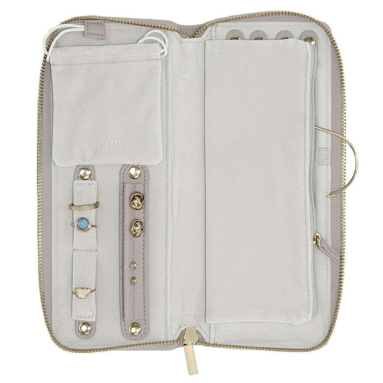 This women's jewellery roll by the brand Stackers is made from faux leather and is showcased in grey. It measures 3cm(height) x 24.5cm(width) x 10.3cm(depth). All the jewellery boxes come complete with stackers packaging. The Stackers Jewellery Roll - Taupe Woven Grey is a must have when on the go! This taupe jewellery roll is perfect for travelling with jewellery and includes a zip closure for extra security.