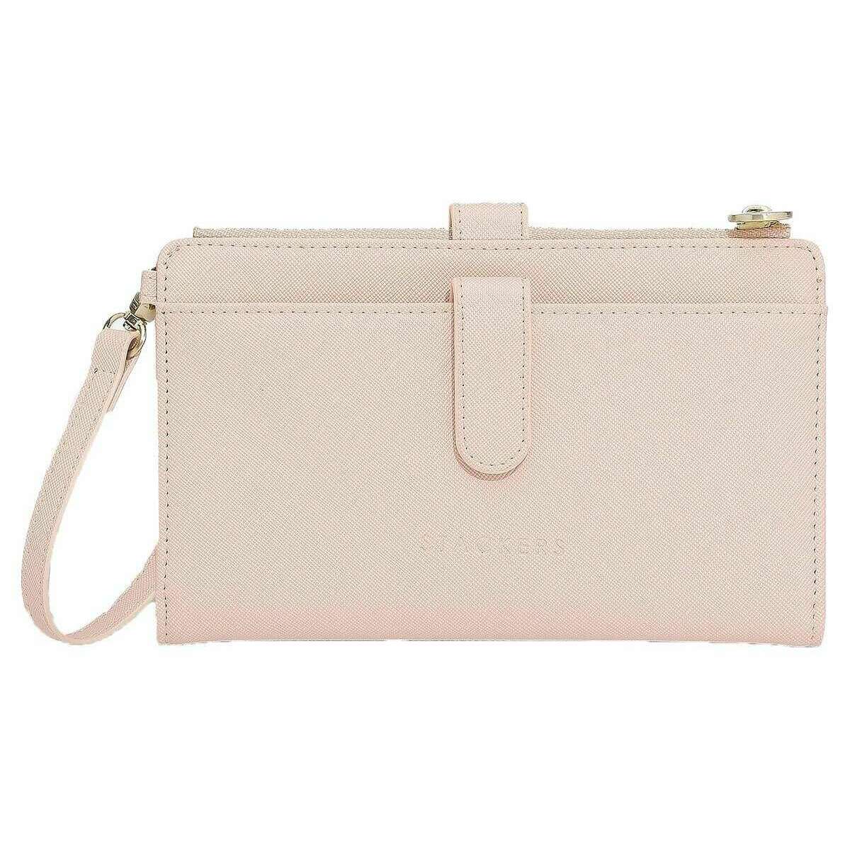 This large purse for women is fashioned by the brand Stackers in a pink colour and is made from faux leather. It measures 12.5cm(height) x 19.5cm(width) x 3cm(depth). All the purses come complete with stackers packaging. The Stackers Large Purse - Blush Pink/Gold is a must have when on the go! This classic and trendy pink and gold purse features multiple pockets for money and cards, a removable card purse and a cosmetic mirror. Comes complete with a removable wrist strap and external phone pocket. Perfect for any outing!