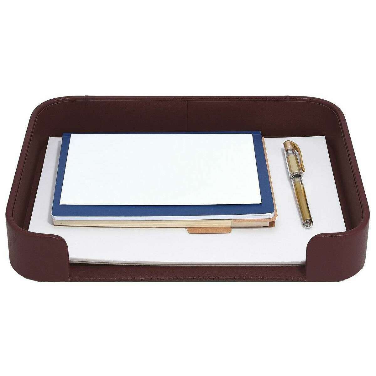 This women's letter tray by the brand Stackers is made from faux leather and is showcased in burgundy. It measures 5cm(height) x 32.5cm(width) x 24.5cm(depth). All the desk accessories come complete with stackers packaging. The Stackers Letter Tray - Garnet Burgundy features a beautiful burgundy design. This letter tray is perfect for storing paper or stationary and can be kept on a desk or in a drawer!